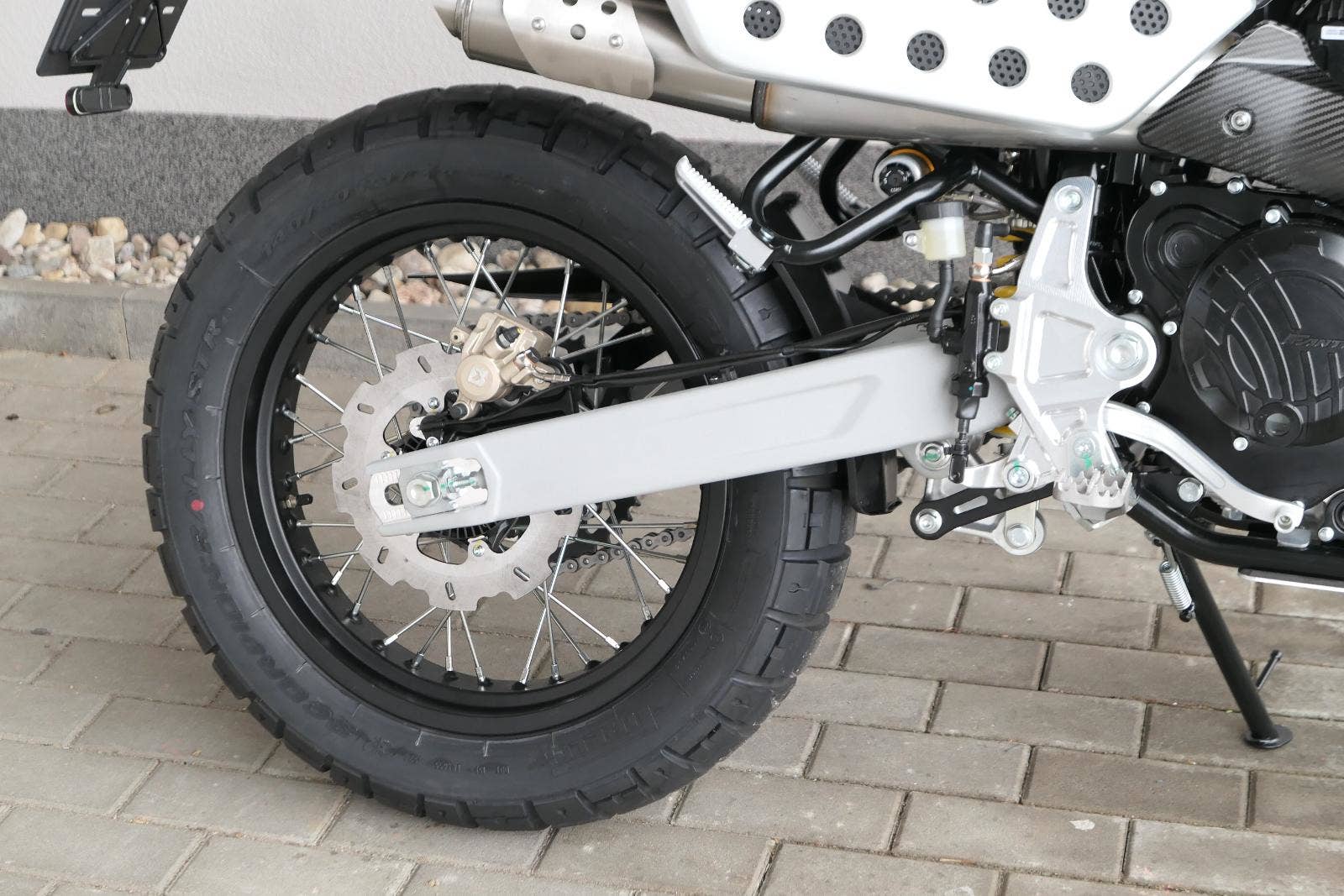 Klíčovým prvkem konstrukce je odpružení s dlouhým zdvihem — 200 mm vpředu i vzadu. Nový model vyniká řadou terénních vylepšení, mezi něž patří nová zadní pružina s předpětím optimalizovaným pro off-road, vylepšená hydraulická vidlice, propracovaný systém lamel a speciální off-roadové osvětlení.