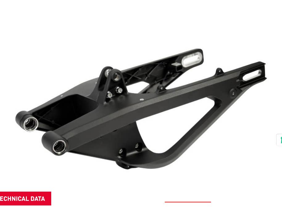 Celohliníková kyvná vidlice je vybavena spodní výztuhou, která maximalizuje konstrukční tuhost bez navýšení hmotnosti. Toto řešení zlepšuje přenos sil mezi zadním kolem a rámem, čímž zvyšuje trakci a stabilitu při akceleraci.