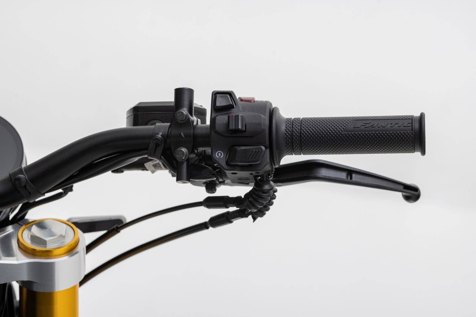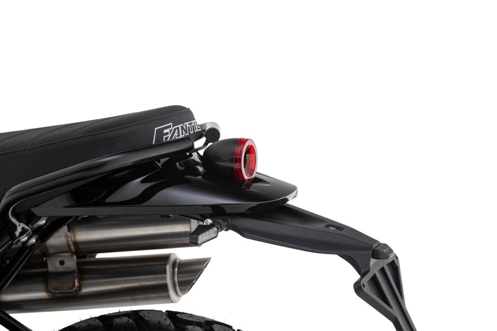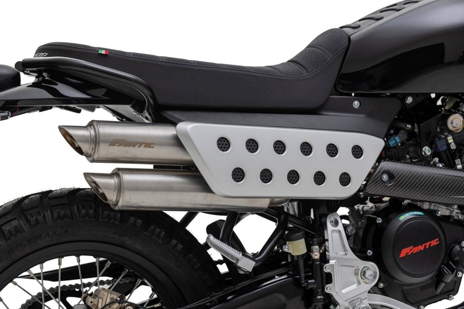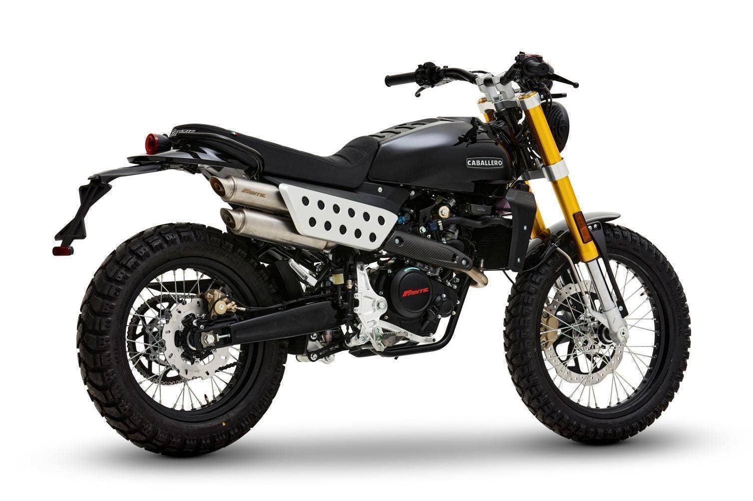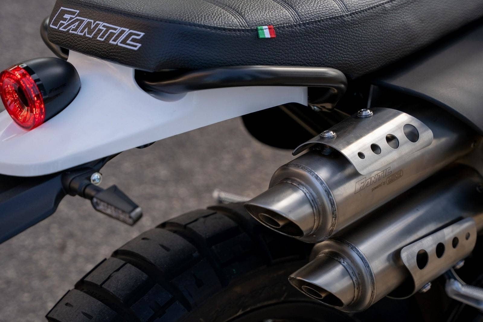 Přední 41mm USD vidlice FANTIC FRS má zdvih 150 mm, zadní odpružení se stejným zdvihem je také tovární FANTIC FSR. U verze Scrambler je nastavitelný odskok u zadního tlumiče.