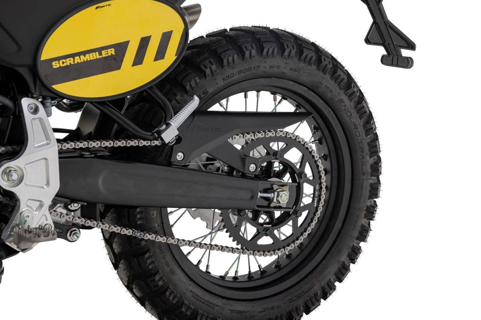 Přední 41mm USD vidlice FANTIC FRS má zdvih 150 mm, zadní odpružení se stejným zdvihem je také tovární FANTIC FSR. U verze Scrambler je nastavitelný odskok u zadního tlumiče.