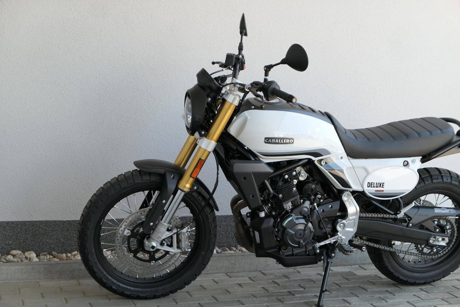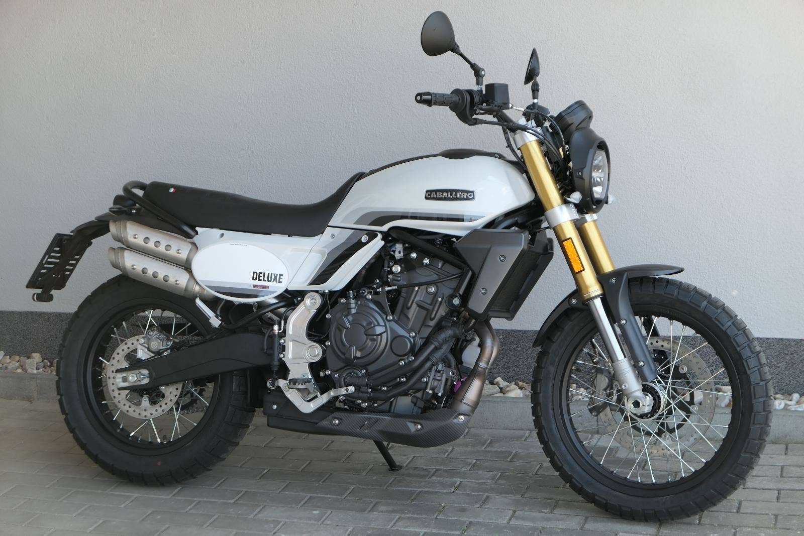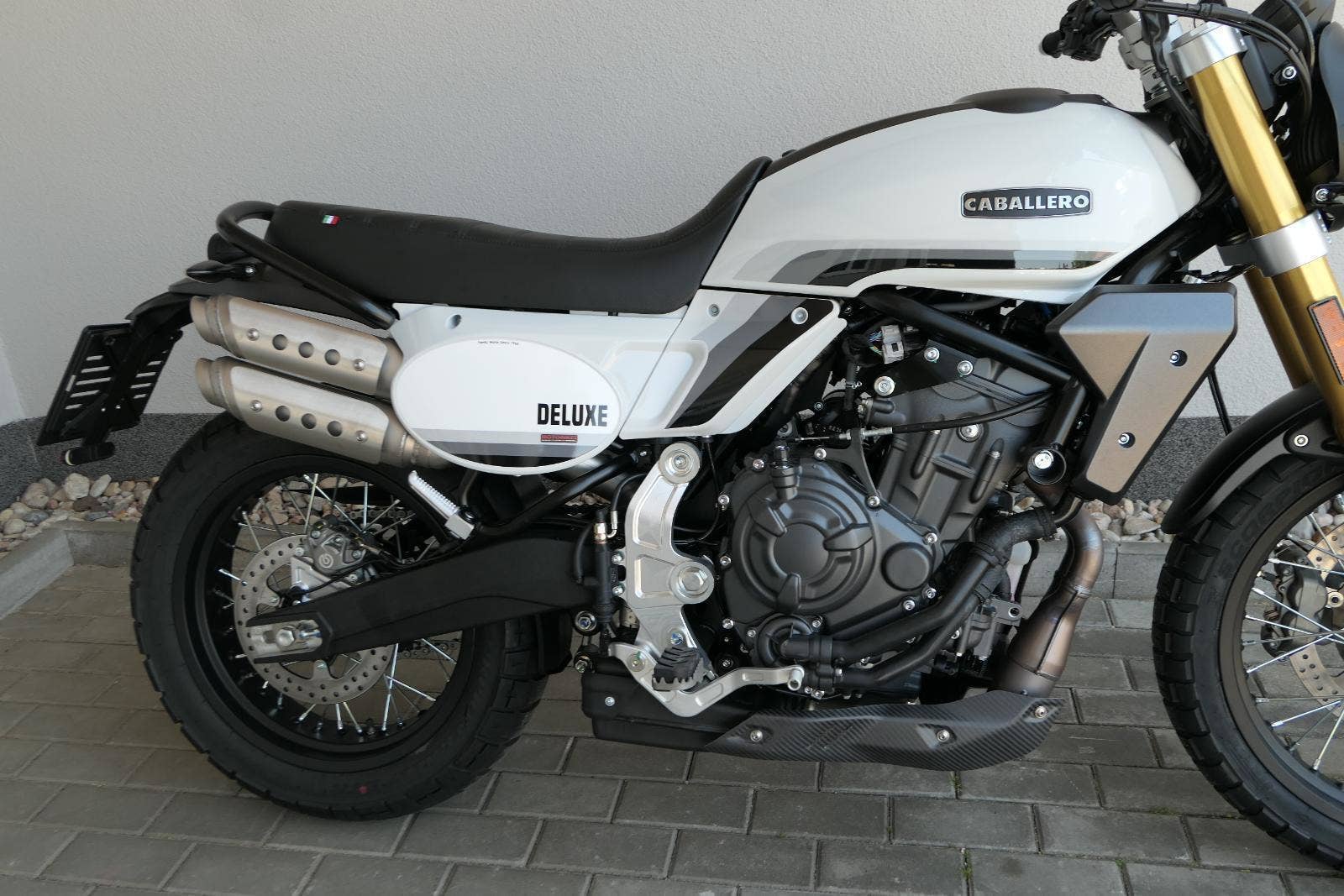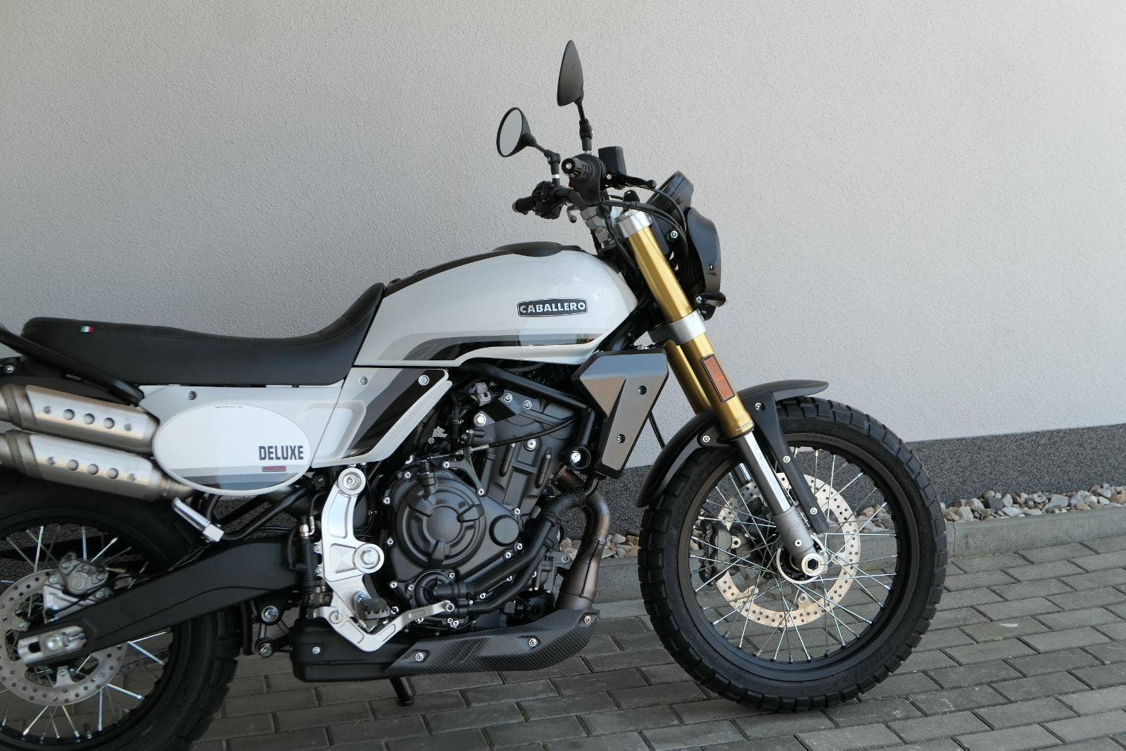 Caballero 700 spojuje výkon paralelního dvouválce Yamaha CP2, špičkovou elektroniku s náklonovým ABS – s možností deativace přímo z řídítek – a nastavitelnou kontrolou trakce, prémiový podvozek Marzocchi a brzdný systém Brembo. Díky nízké hmotnosti 175 kg, 19″ a 17″, drátovým kolům a optimalizovanému odpružení zvládá s lehkostí silnice i terén, přesně tak, jak se na autentický scrambler patří.