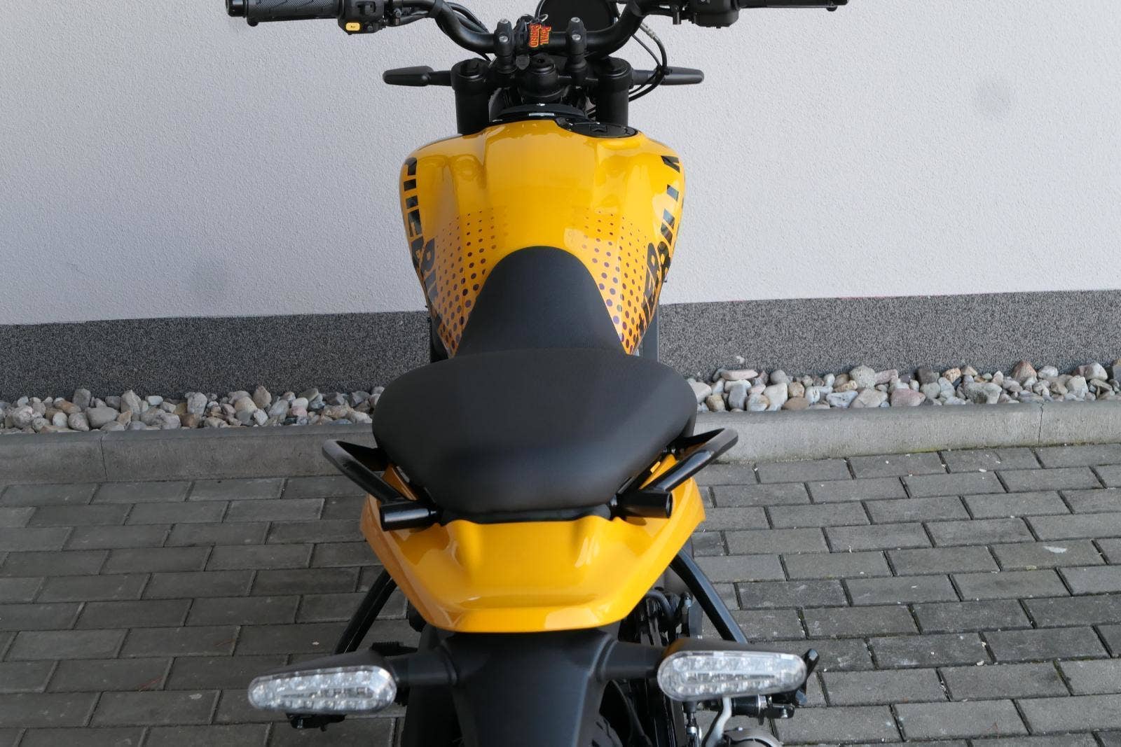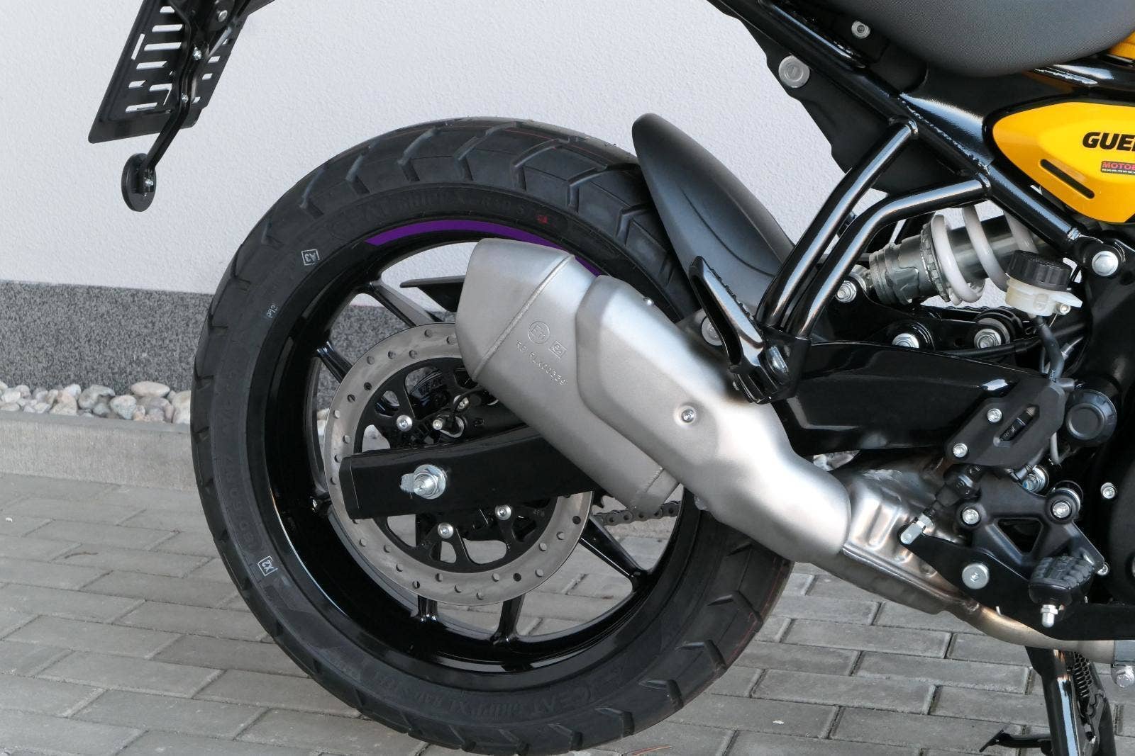 Kola jsou sedmnáctipalcová a Guerilla se chlubí přístupnou výškou sedla 780 milimetrů, stejně jako příjemnou pohotovostní hmotností 184 kilogramů. S ohledem na výkon a hmotnost jsou celkem dostačující i brzdy – vpředu jeden kotouč 310 milimetrů s dvoupístkovým brzdičem, vzadu 270 milimetrů s jednopístem. Do nádrže se vejde jenom skromných 11 litrů, na druhou stranu výrobce uvádí i skromnou tabulkovou spotřebu 3,39 litru na 100 kilometrů.