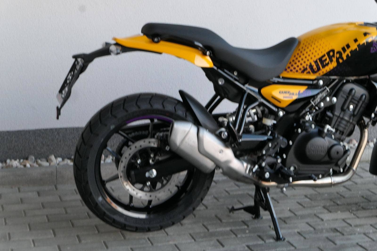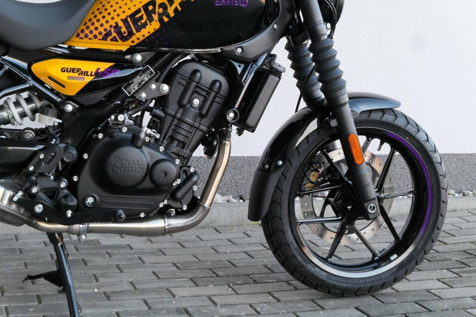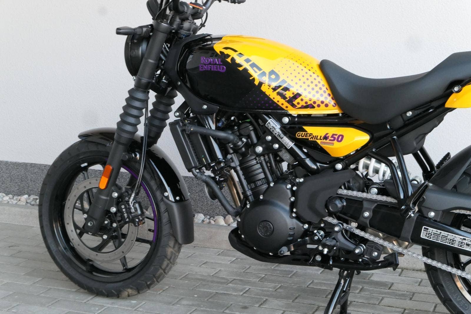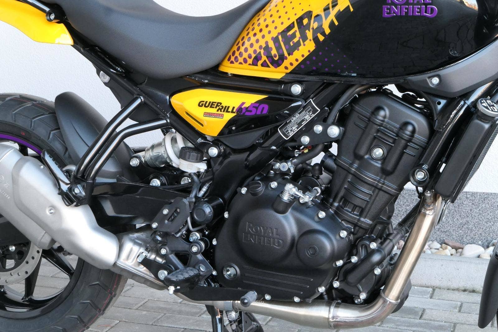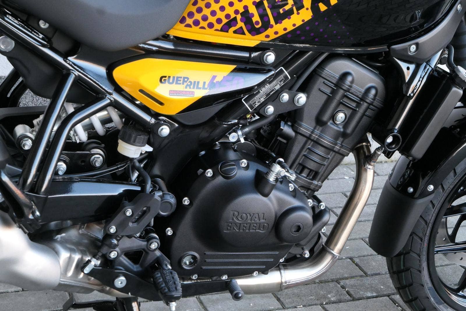 Z dosavadní modelové řady má Guerilla nejblíž Hunteru, působí ale moderněji a má i výrazně modernější techniku. Tak jako u aktuálního silnějšího Himalayanu 450 tvoří základ motorky trubkový páteřový rám, a v něm jako nosný prvek kapalinou chlazený jednoválec Sherpa o objemu 452 cm3. Relativně nový čtyřventil je mnohem výkonnější jednotkou než starší a menší vzduchem chlazené agregáty. Konkrétně nabídne rovných 40 koní v 8 000 otáčkách, a aby se to dobře pamatovalo tak i 40 Nm, které vrcholí v 5 500 otáčkách. Motor už má elektronický plyn a díky tomu i volitelné jízdní režimy – je ale poměrně jasné, který z dvojice „Eco“ a „Performance“ drtivá většina jezdců zvolí.
