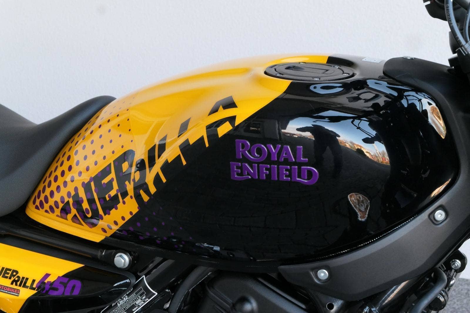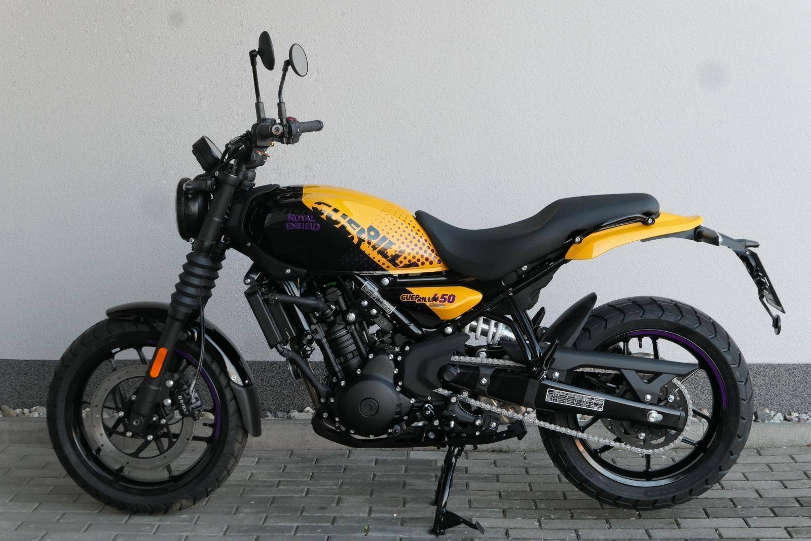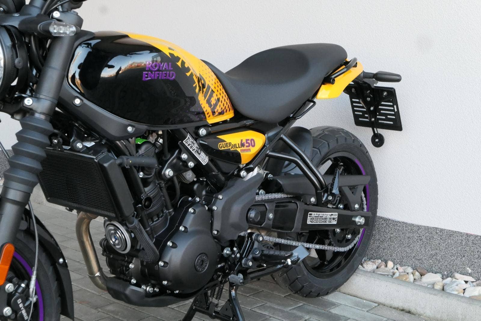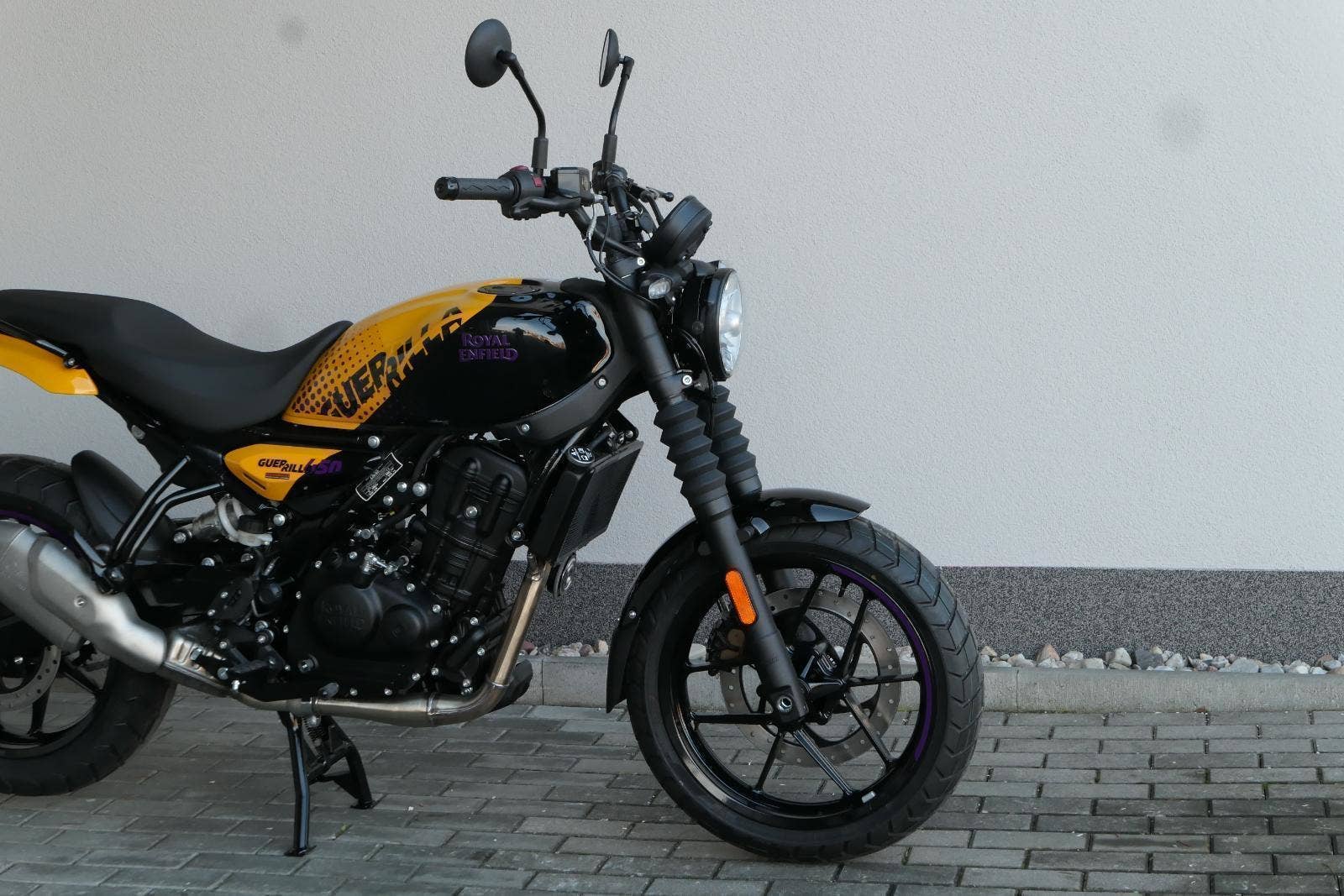 Z dosavadní modelové řady má Guerilla nejblíž Hunteru, působí ale moderněji a má i výrazně modernější techniku. Tak jako u aktuálního silnějšího Himalayanu 450 tvoří základ motorky trubkový páteřový rám, a v něm jako nosný prvek kapalinou chlazený jednoválec Sherpa o objemu 452 cm3. Relativně nový čtyřventil je mnohem výkonnější jednotkou než starší a menší vzduchem chlazené agregáty. Konkrétně nabídne rovných 40 koní v 8 000 otáčkách, a aby se to dobře pamatovalo tak i 40 Nm, které vrcholí v 5 500 otáčkách. Motor už má elektronický plyn a díky tomu i volitelné jízdní režimy – je ale poměrně jasné, který z dvojice „Eco“ a „Performance“ drtivá většina jezdců zvolí.