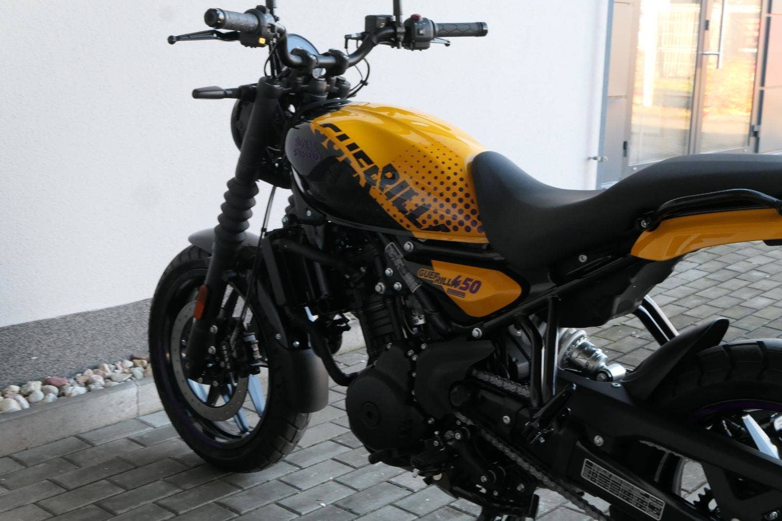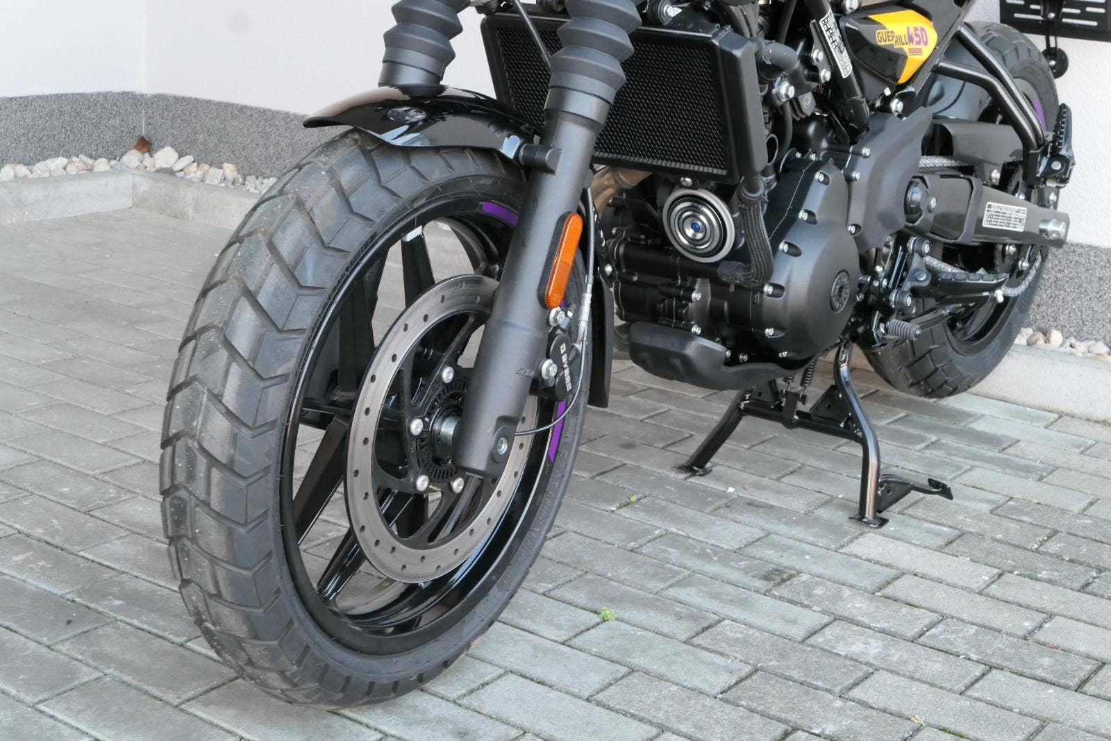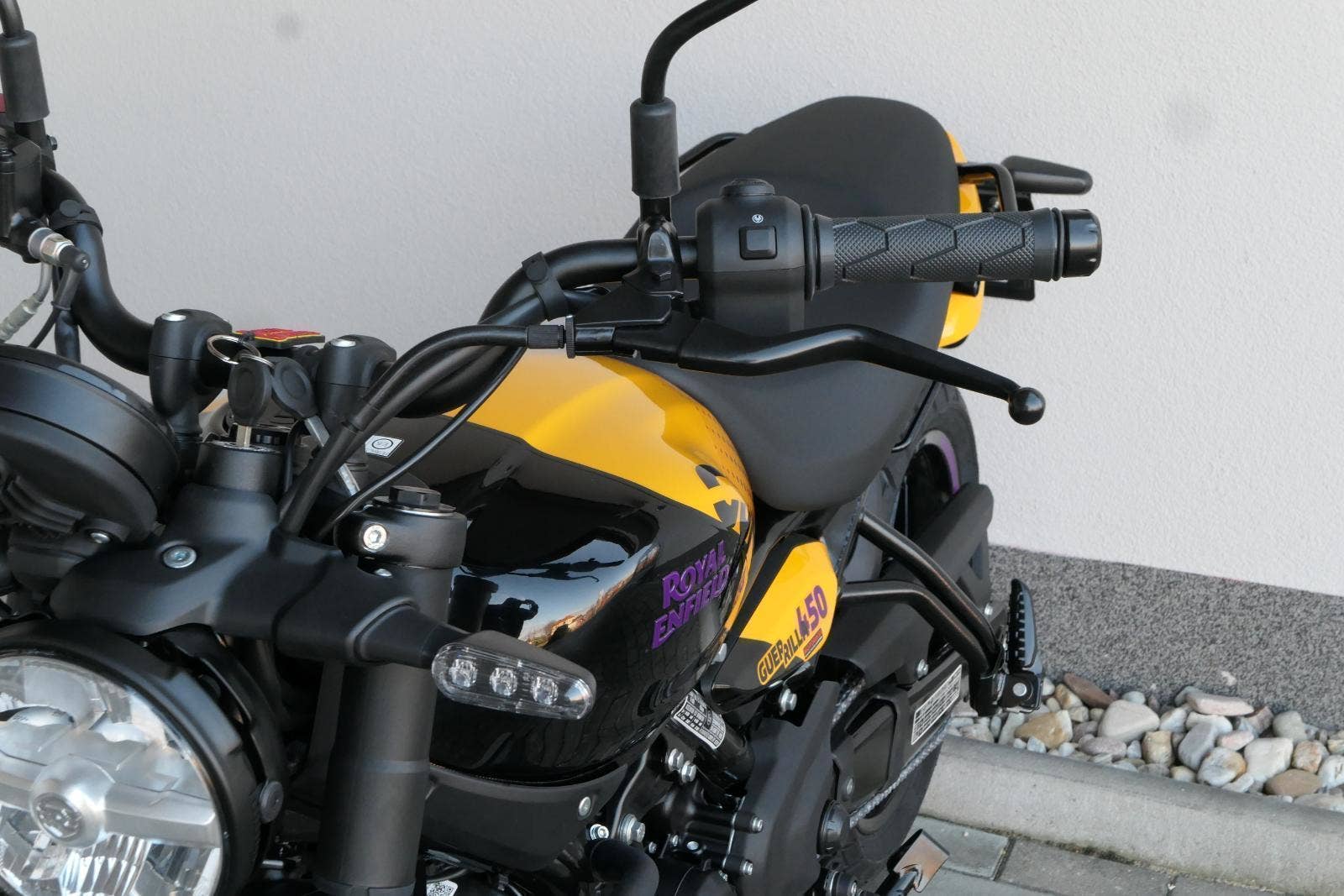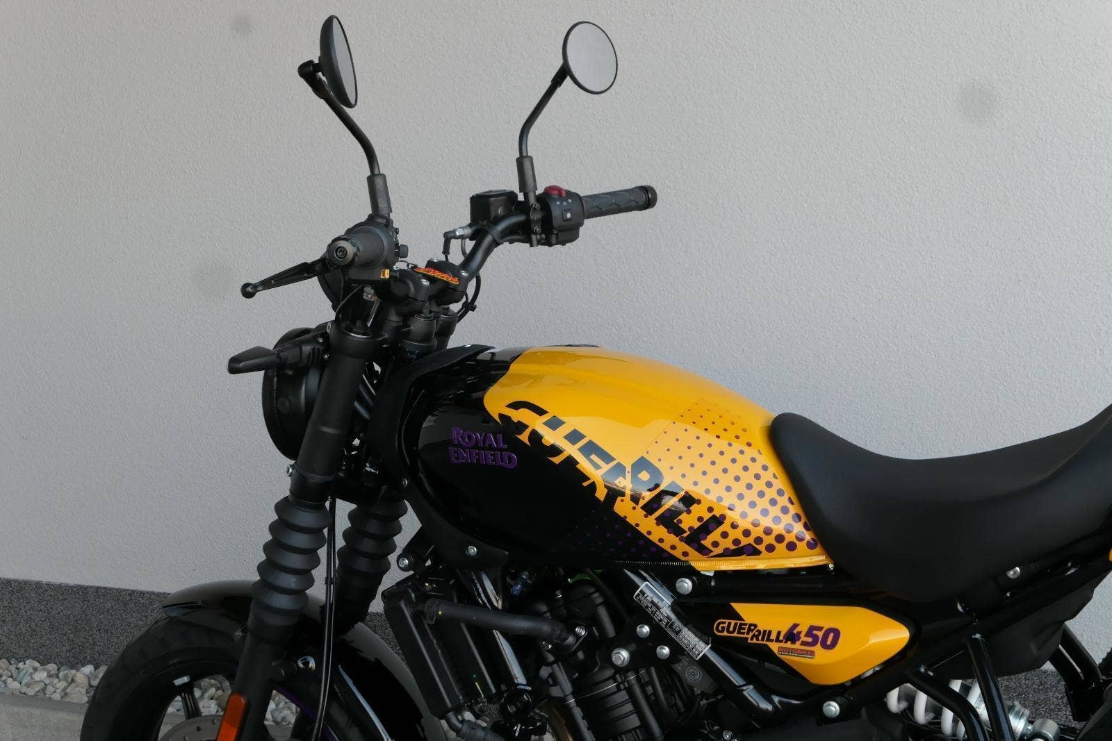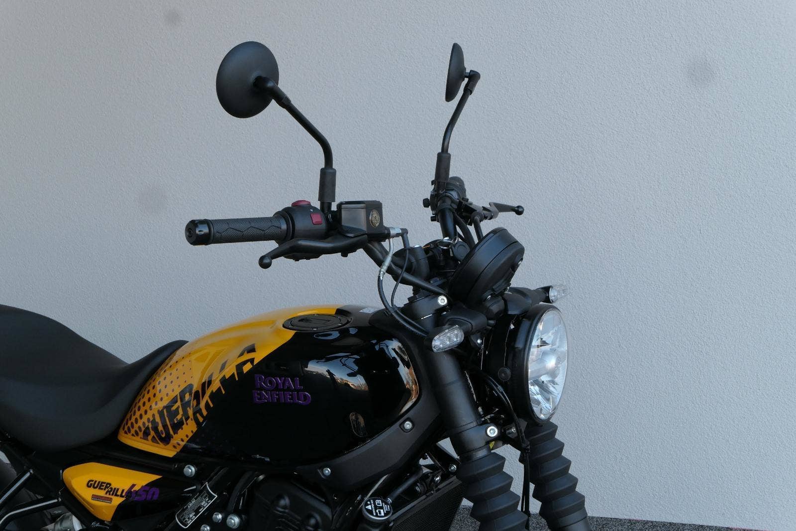 Z dosavadní modelové řady má Guerilla nejblíž Hunteru, působí ale moderněji a má i výrazně modernější techniku. Tak jako u aktuálního silnějšího Himalayanu 450 tvoří základ motorky trubkový páteřový rám, a v něm jako nosný prvek kapalinou chlazený jednoválec Sherpa o objemu 452 cm3. Relativně nový čtyřventil je mnohem výkonnější jednotkou než starší a menší vzduchem chlazené agregáty. Konkrétně nabídne rovných 40 koní v 8 000 otáčkách, a aby se to dobře pamatovalo tak i 40 Nm, které vrcholí v 5 500 otáčkách. Motor už má elektronický plyn a díky tomu i volitelné jízdní režimy – je ale poměrně jasné, který z dvojice „Eco“ a „Performance“ drtivá většina jezdců zvolí.