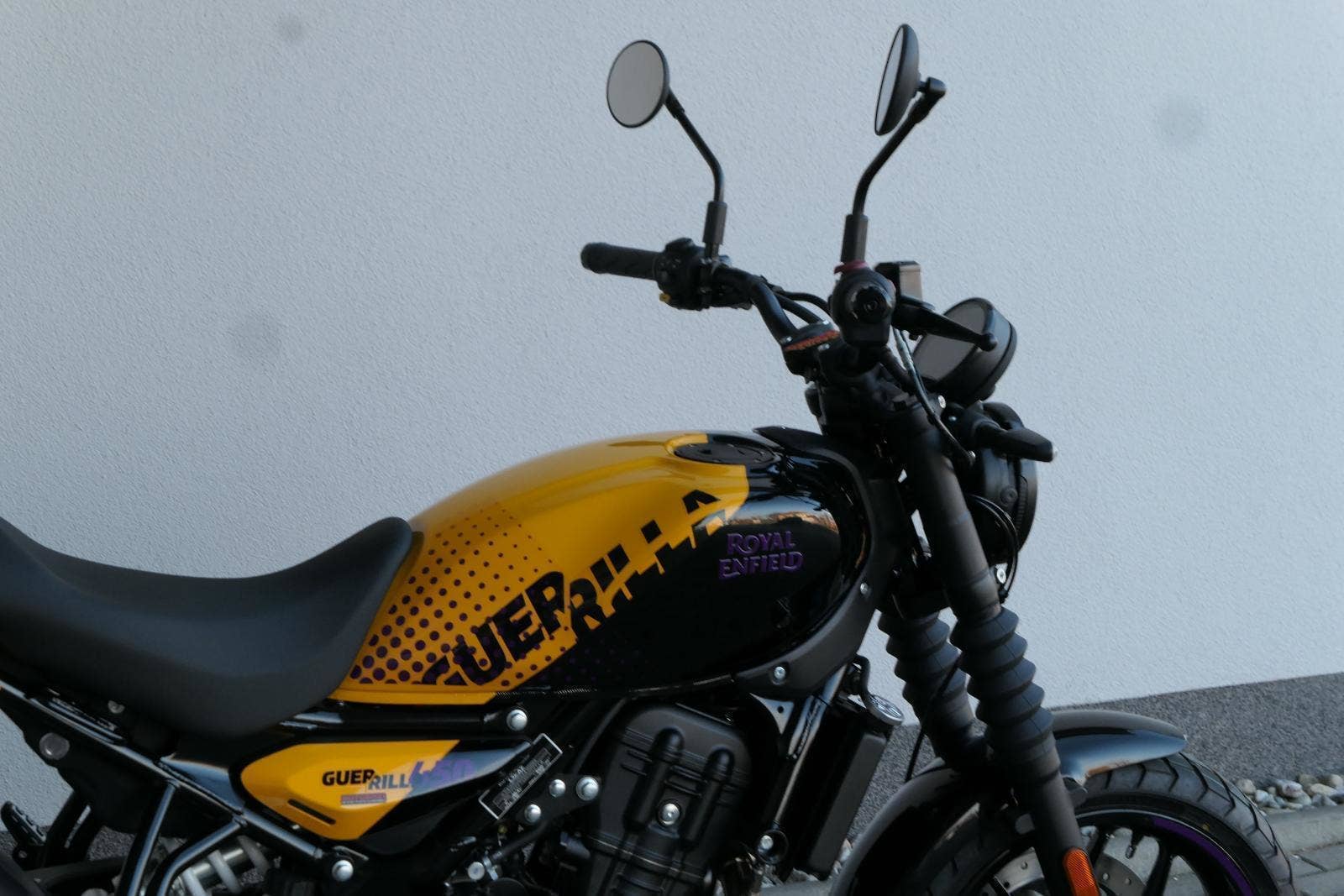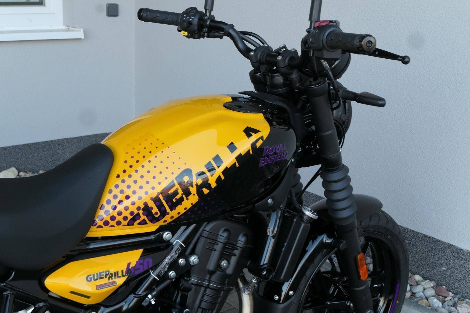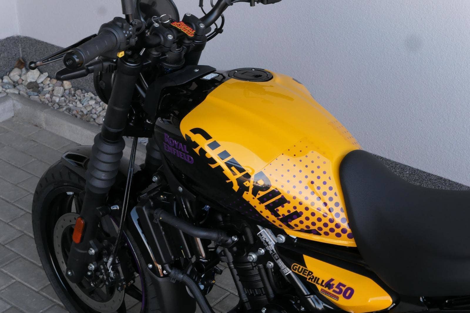 Royal Enfield Guerrilla 450 sdílí motor a technický základ s cestovním endurem Himalayan 450, stojí ale na malých silničních kolech a místo cestování míří na každodenní dojíždění, i na radovánky okolo komína.