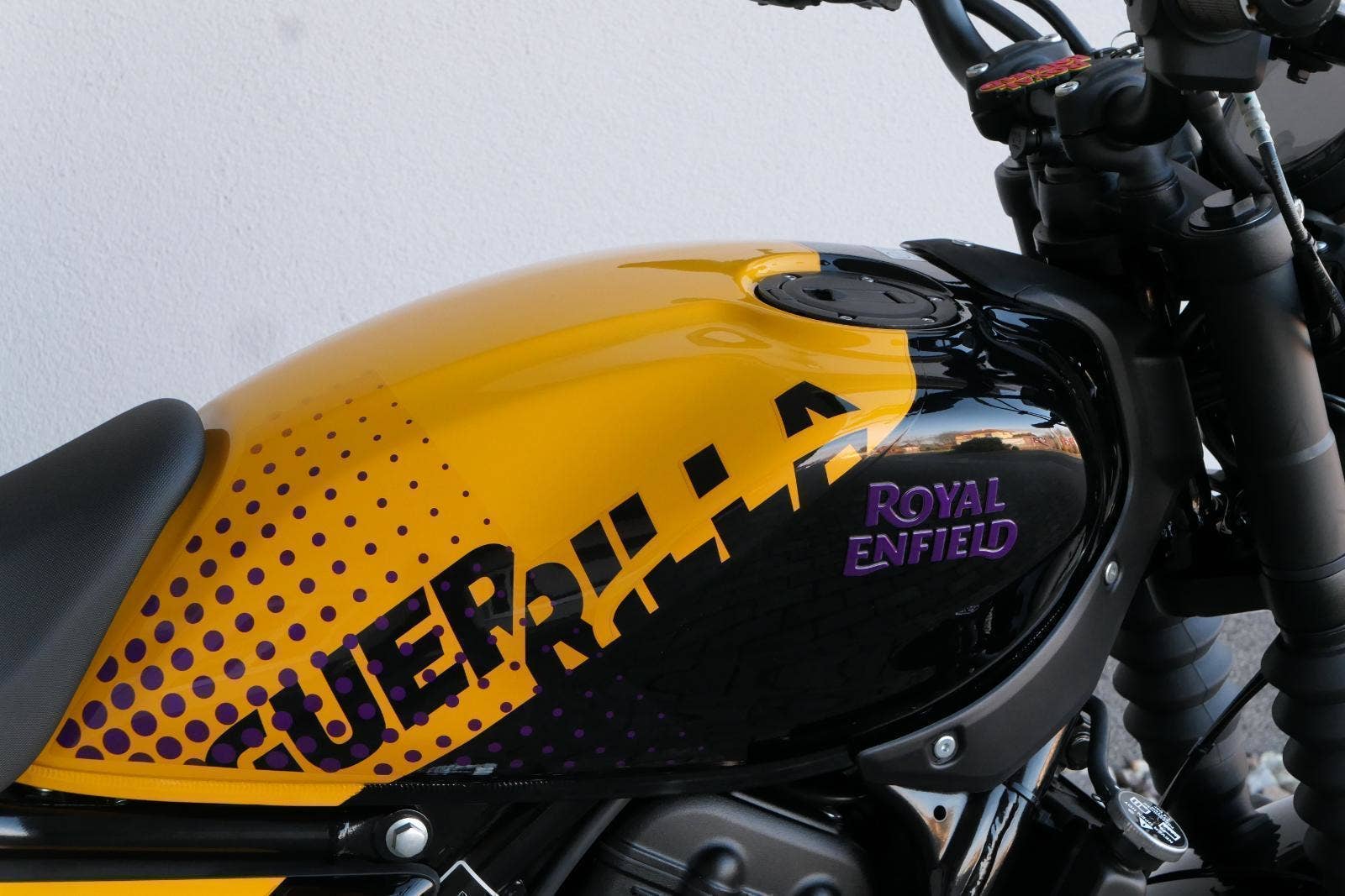 Celkově má Guerilla poměrně moderní tvary, Royal ale zdůrazňuje, že zde nejsou žádné nadbytečné plasty a serepetičky, a že jde v principu o jednoduchou a zábavnou motorku – což koneckonců spojuje všechny modely Royal Enfieldu. Opět je nutné pochválit výběr barev, který je vychytaný přesně tak, jak jsme u Royalu zvyklí. Z celkem pěti zbarvení je jenom jedno nudné, a sice jednolitá stříbrná Smoke Silver. Zbytek, tedy Brava Blue, Yellow Ribbon, Playa Black a Gold Dip zajímavě kombinují barevnou grafiku a ve třech případech dostanete i barevné ráfky.