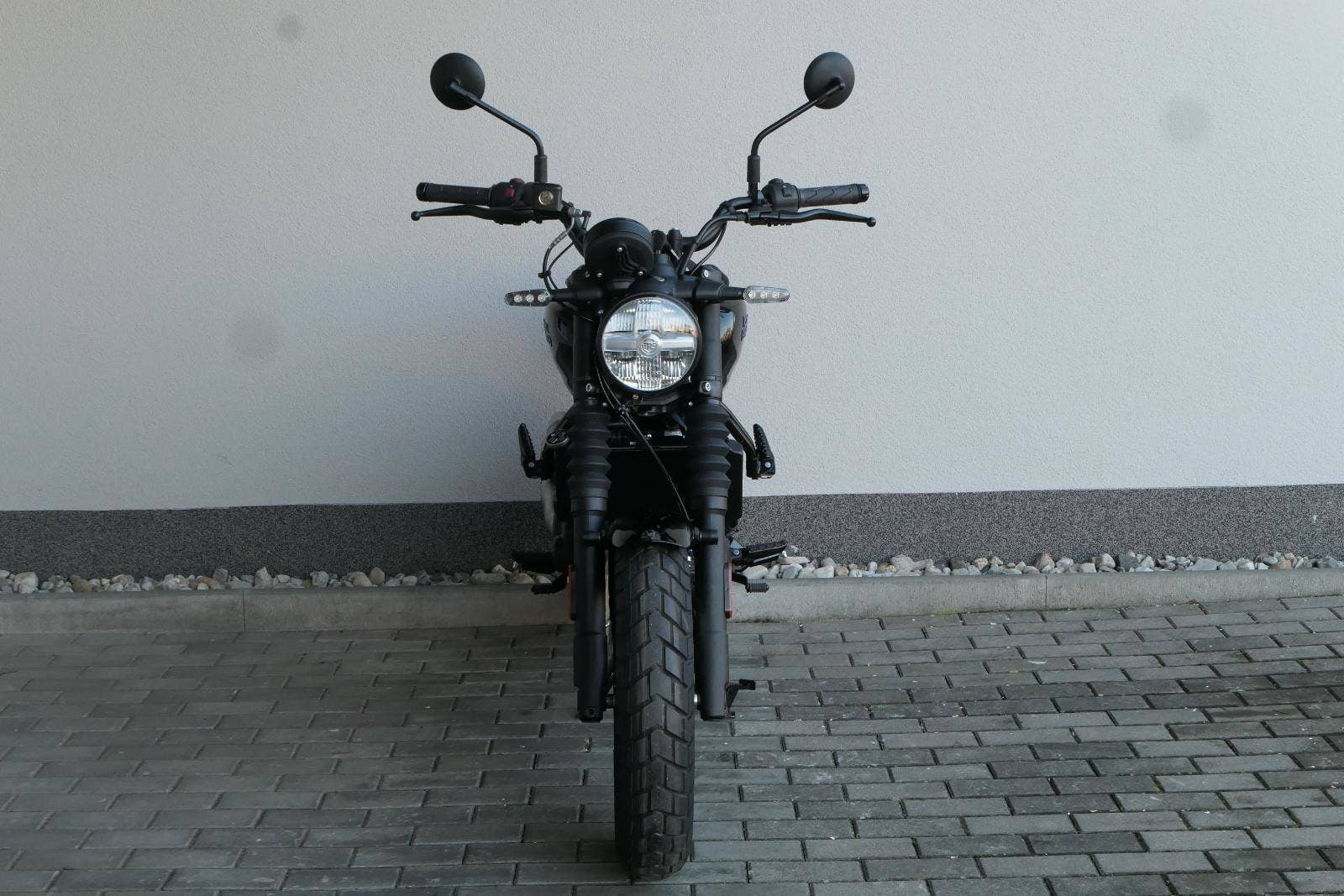Na rozdíl od Himalayanu, nedělá si Guerrilla terénní ambice, byť některými prvky decentně připomíná, že je vlastně naháčo-scrambler – ve všech tiskových materiálech se pak objevuje populární termín „roadster“. Na teleskopických vidlicích jsou třeba prďácké retro prachovky, nicméně zdvih je jenom 140 milimetrů. Zadní vyosený centrál má potom 150 milimetrů.