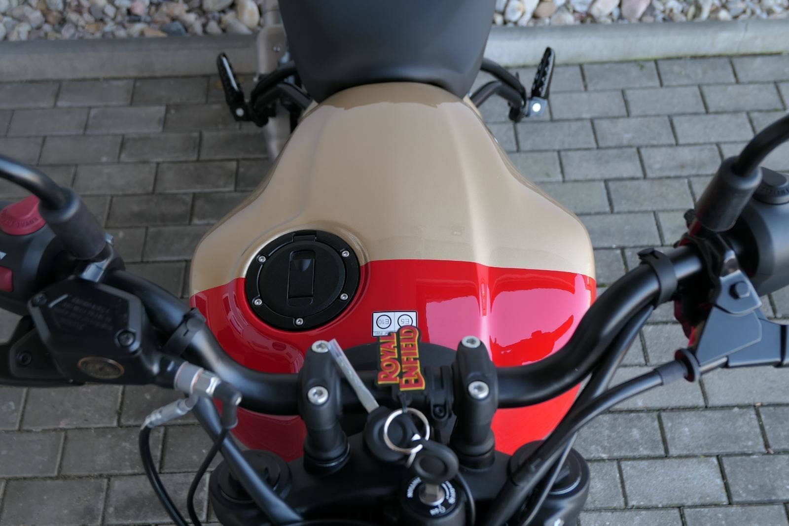 Celkově má Guerilla poměrně moderní tvary, Royal ale zdůrazňuje, že zde nejsou žádné nadbytečné plasty a serepetičky, a že jde v principu o jednoduchou a zábavnou motorku – což koneckonců spojuje všechny modely Royal Enfieldu. Opět je nutné pochválit výběr barev, který je vychytaný přesně tak, jak jsme u Royalu zvyklí. Z celkem pěti zbarvení je jenom jedno nudné, a sice jednolitá stříbrná Smoke Silver. Zbytek, tedy Brava Blue, Yellow Ribbon, Playa Black a Gold Dip zajímavě kombinují barevnou grafiku a ve třech případech dostanete i barevné ráfky.