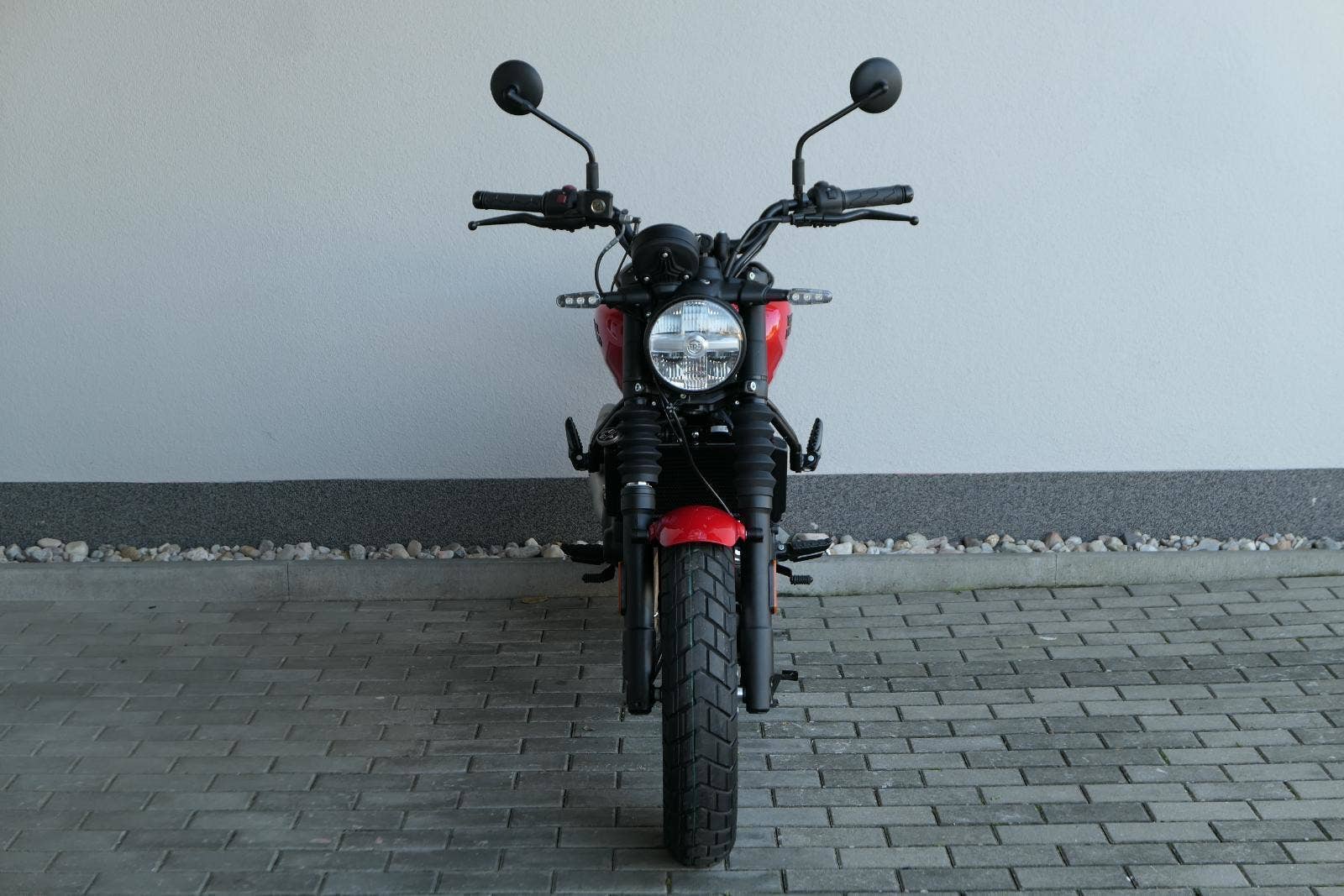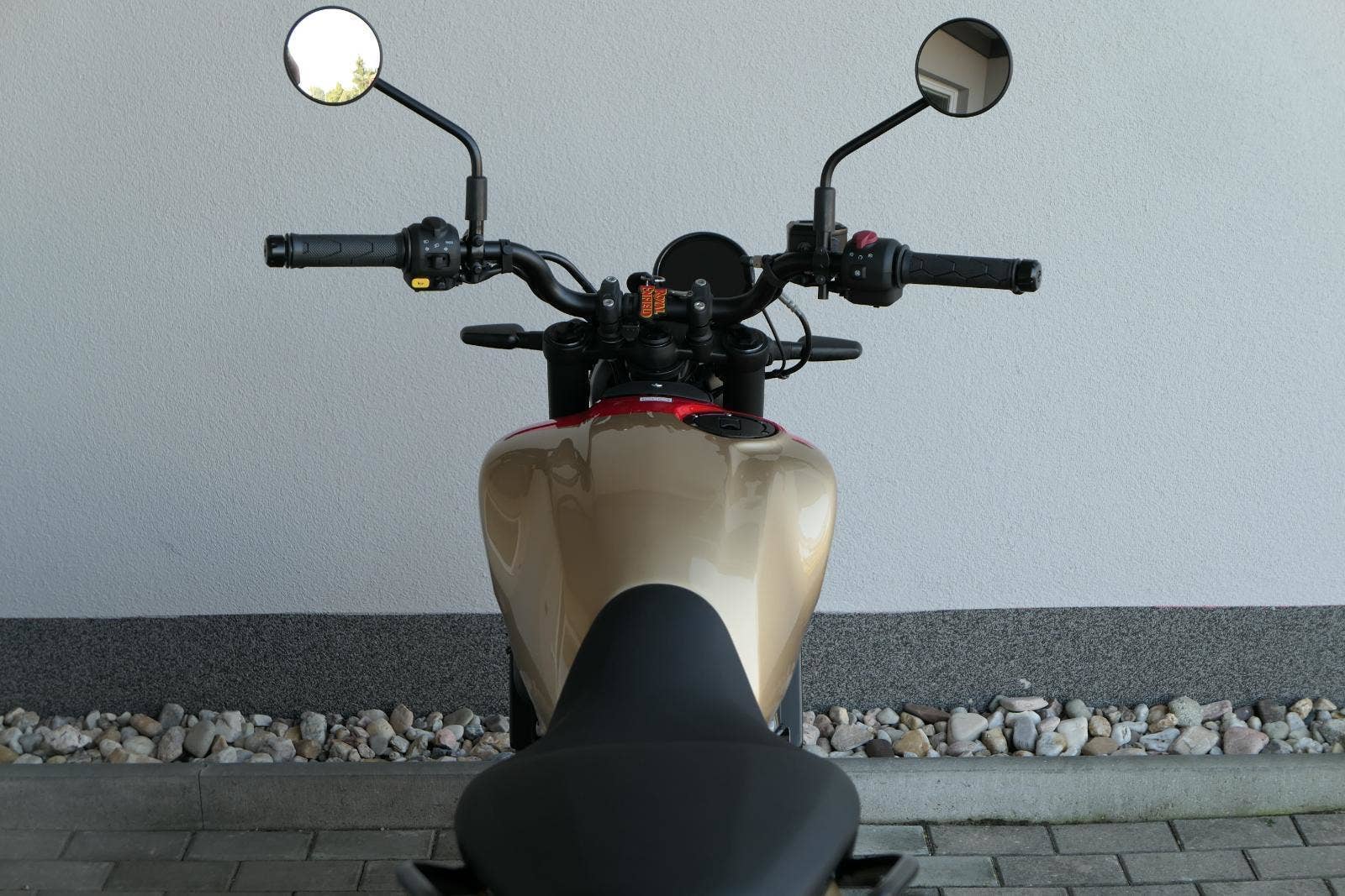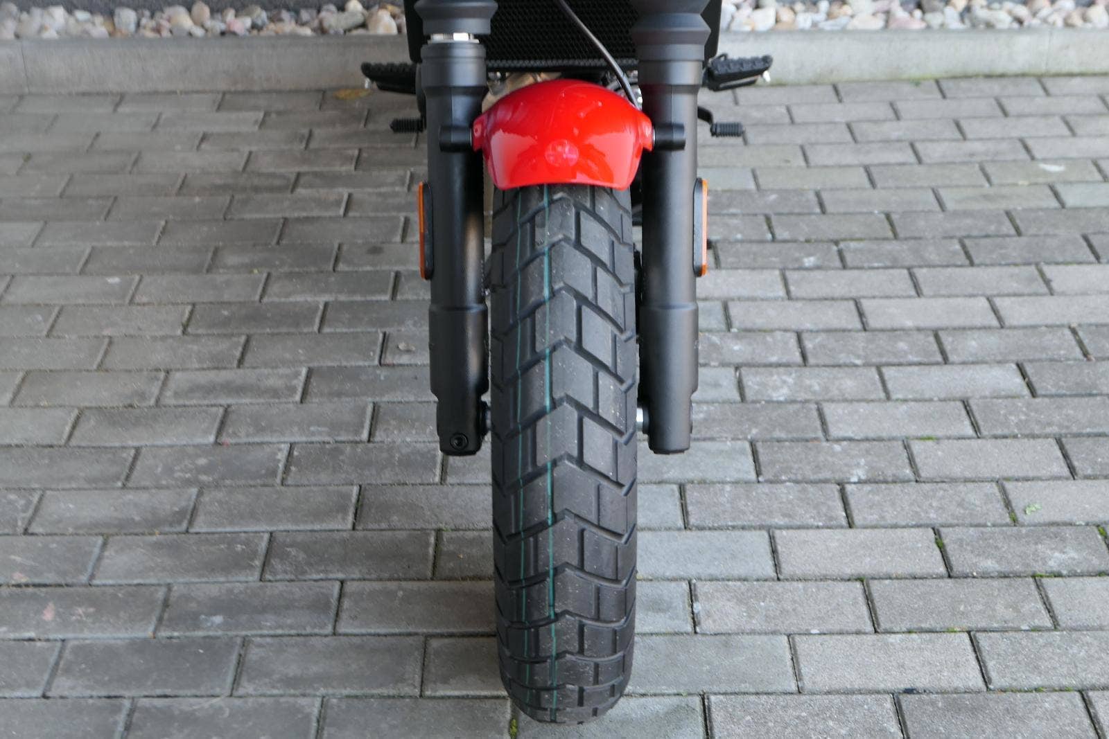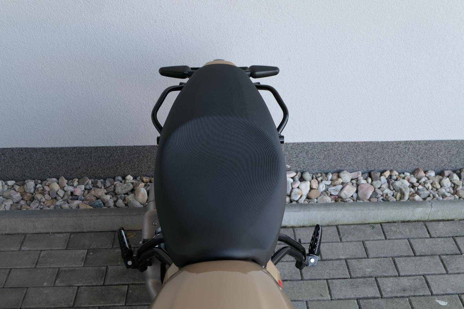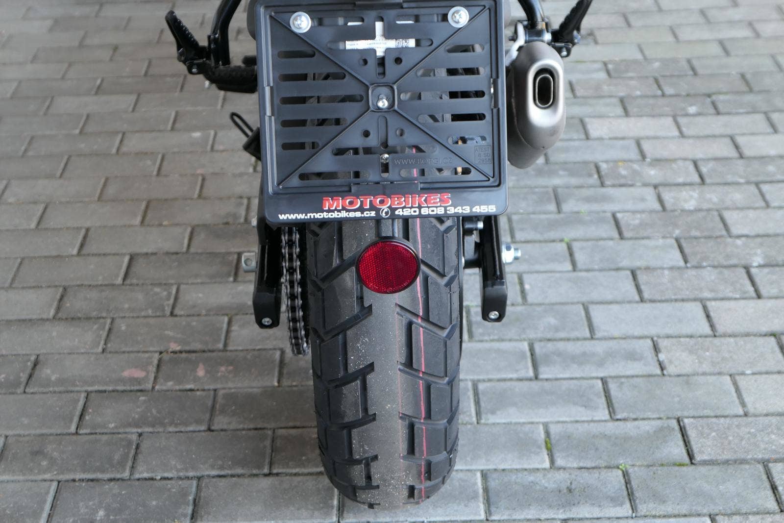Na rozdíl od Himalayanu, nedělá si Guerrilla terénní ambice, byť některými prvky decentně připomíná, že je vlastně naháčo-scrambler – ve všech tiskových materiálech se pak objevuje populární termín „roadster“. Na teleskopických vidlicích jsou třeba prďácké retro prachovky, nicméně zdvih je jenom 140 milimetrů. Zadní vyosený centrál má potom 150 milimetrů.