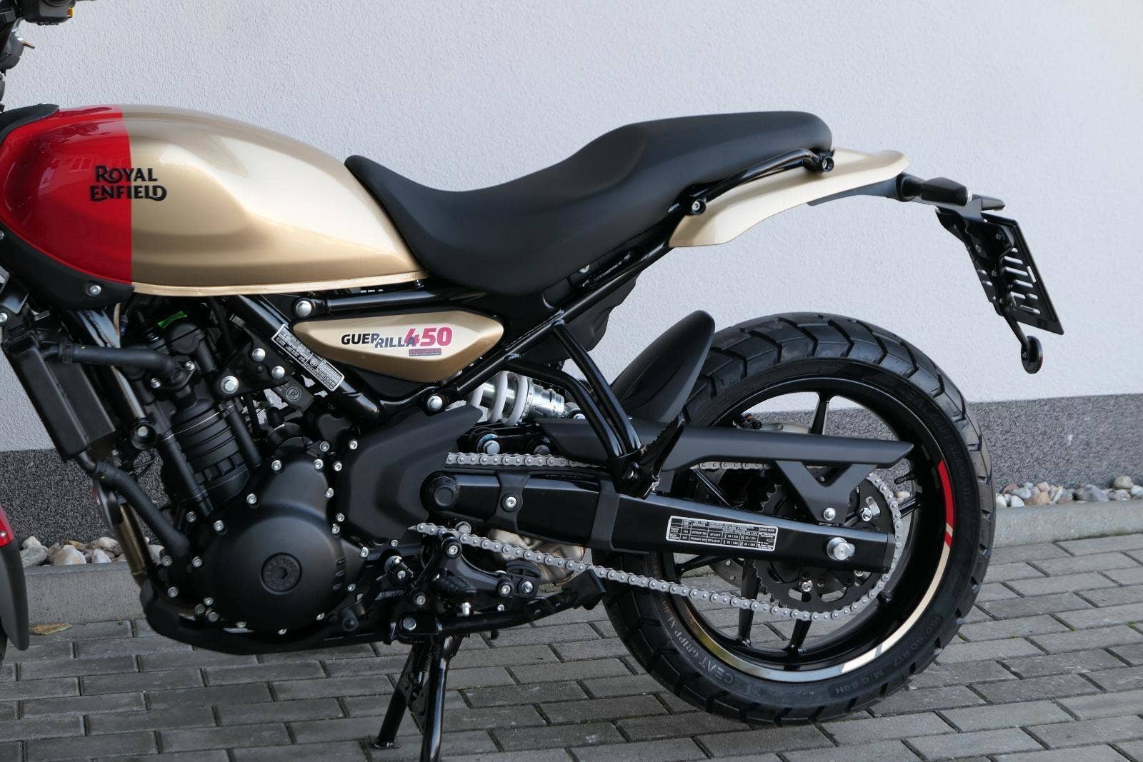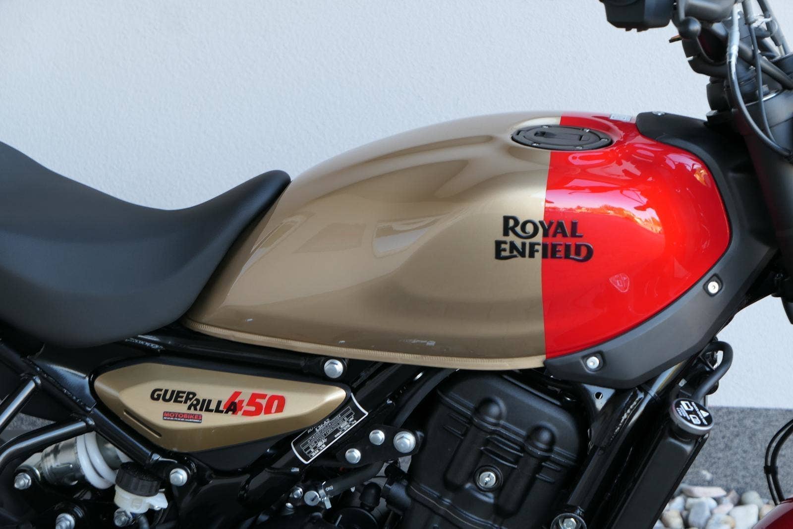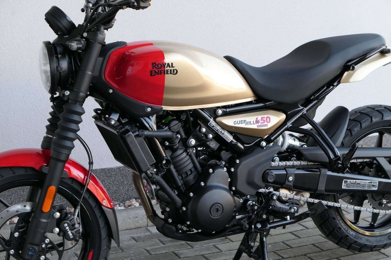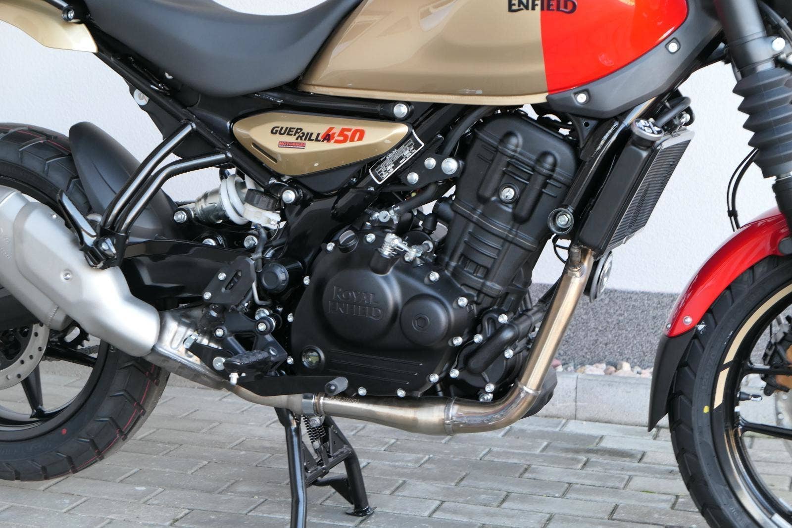 Z dosavadní modelové řady má Guerilla nejblíž Hunteru, působí ale moderněji a má i výrazně modernější techniku. Tak jako u aktuálního silnějšího Himalayanu 450 tvoří základ motorky trubkový páteřový rám, a v něm jako nosný prvek kapalinou chlazený jednoválec Sherpa o objemu 452 cm3. Relativně nový čtyřventil je mnohem výkonnější jednotkou než starší a menší vzduchem chlazené agregáty. Konkrétně nabídne rovných 40 koní v 8 000 otáčkách, a aby se to dobře pamatovalo tak i 40 Nm, které vrcholí v 5 500 otáčkách. Motor už má elektronický plyn a díky tomu i volitelné jízdní režimy – je ale poměrně jasné, který z dvojice „Eco“ a „Performance“ drtivá většina jezdců zvolí.