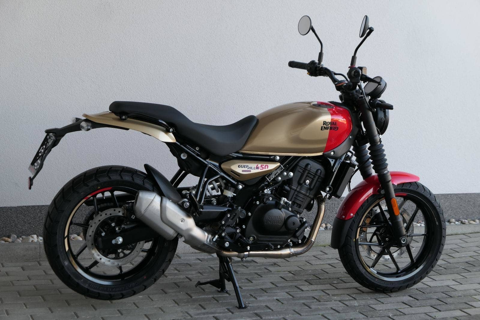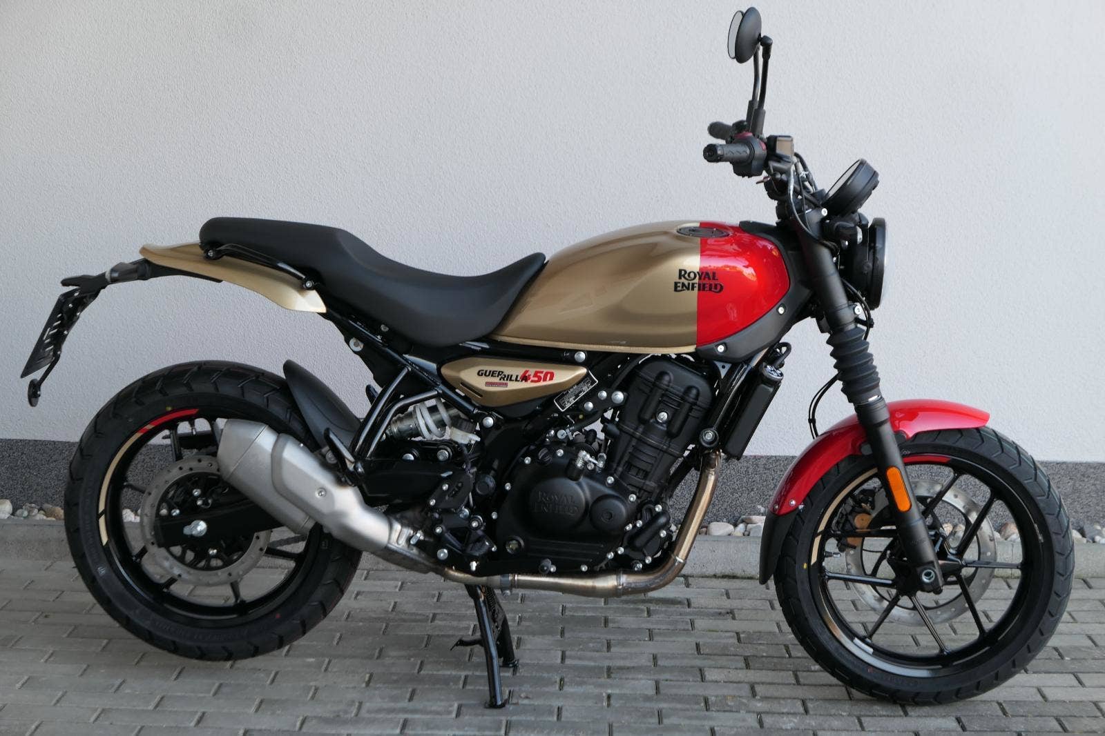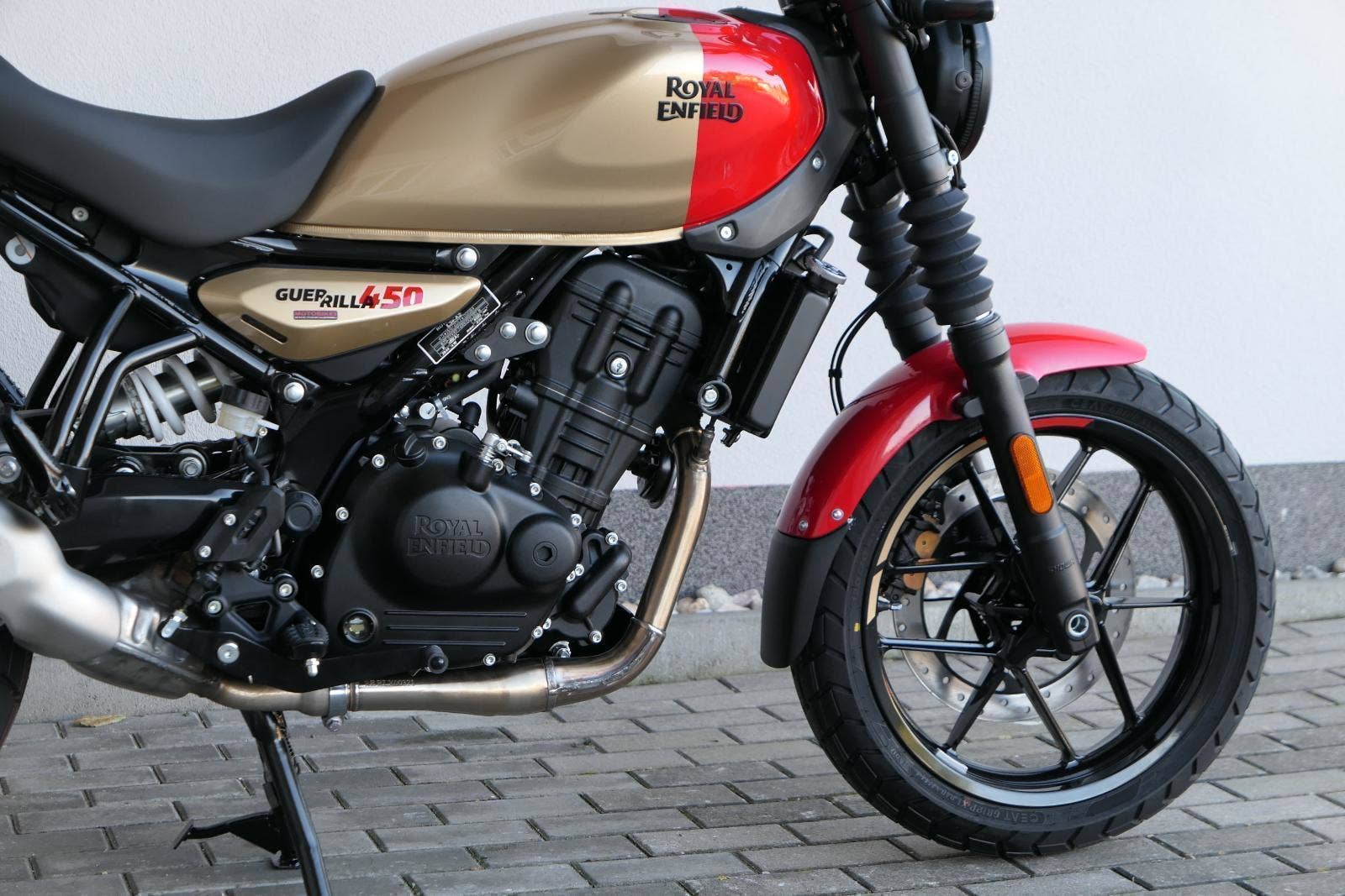 Z dosavadní modelové řady má Guerilla nejblíž Hunteru, působí ale moderněji a má i výrazně modernější techniku. Tak jako u aktuálního silnějšího Himalayanu 450 tvoří základ motorky trubkový páteřový rám, a v něm jako nosný prvek kapalinou chlazený jednoválec Sherpa o objemu 452 cm3. Relativně nový čtyřventil je mnohem výkonnější jednotkou než starší a menší vzduchem chlazené agregáty. Konkrétně nabídne rovných 40 koní v 8 000 otáčkách, a aby se to dobře pamatovalo tak i 40 Nm, které vrcholí v 5 500 otáčkách. Motor už má elektronický plyn a díky tomu i volitelné jízdní režimy – je ale poměrně jasné, který z dvojice „Eco“ a „Performance“ drtivá většina jezdců zvolí.