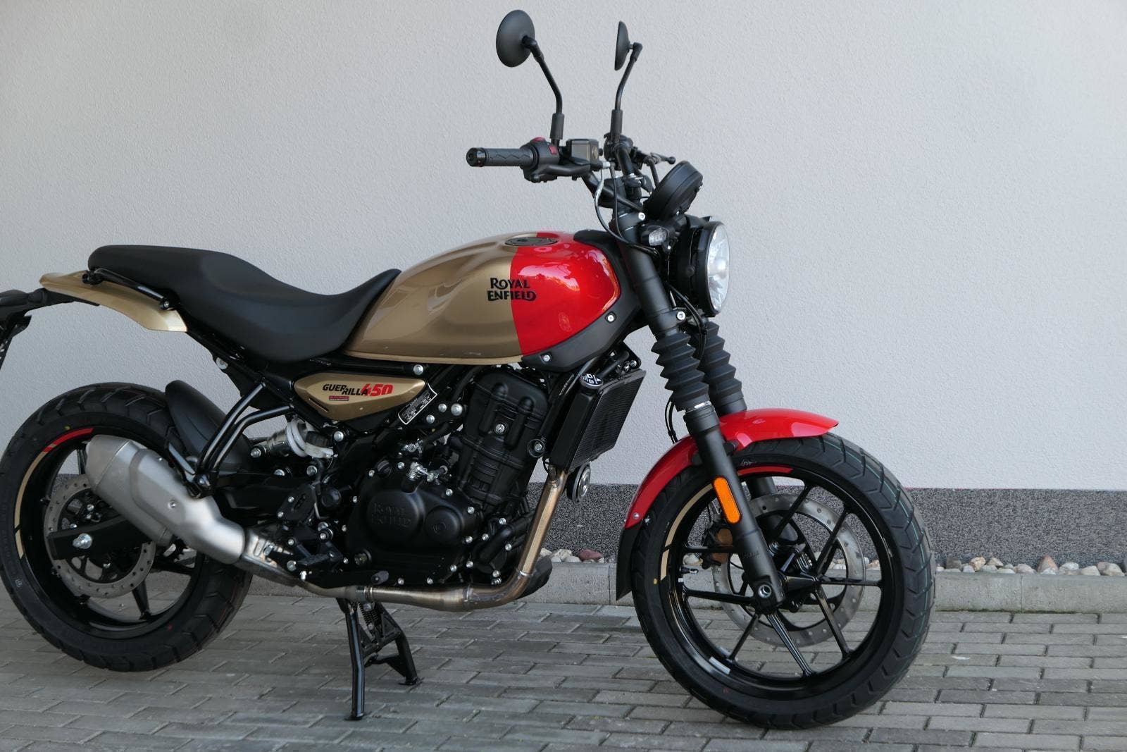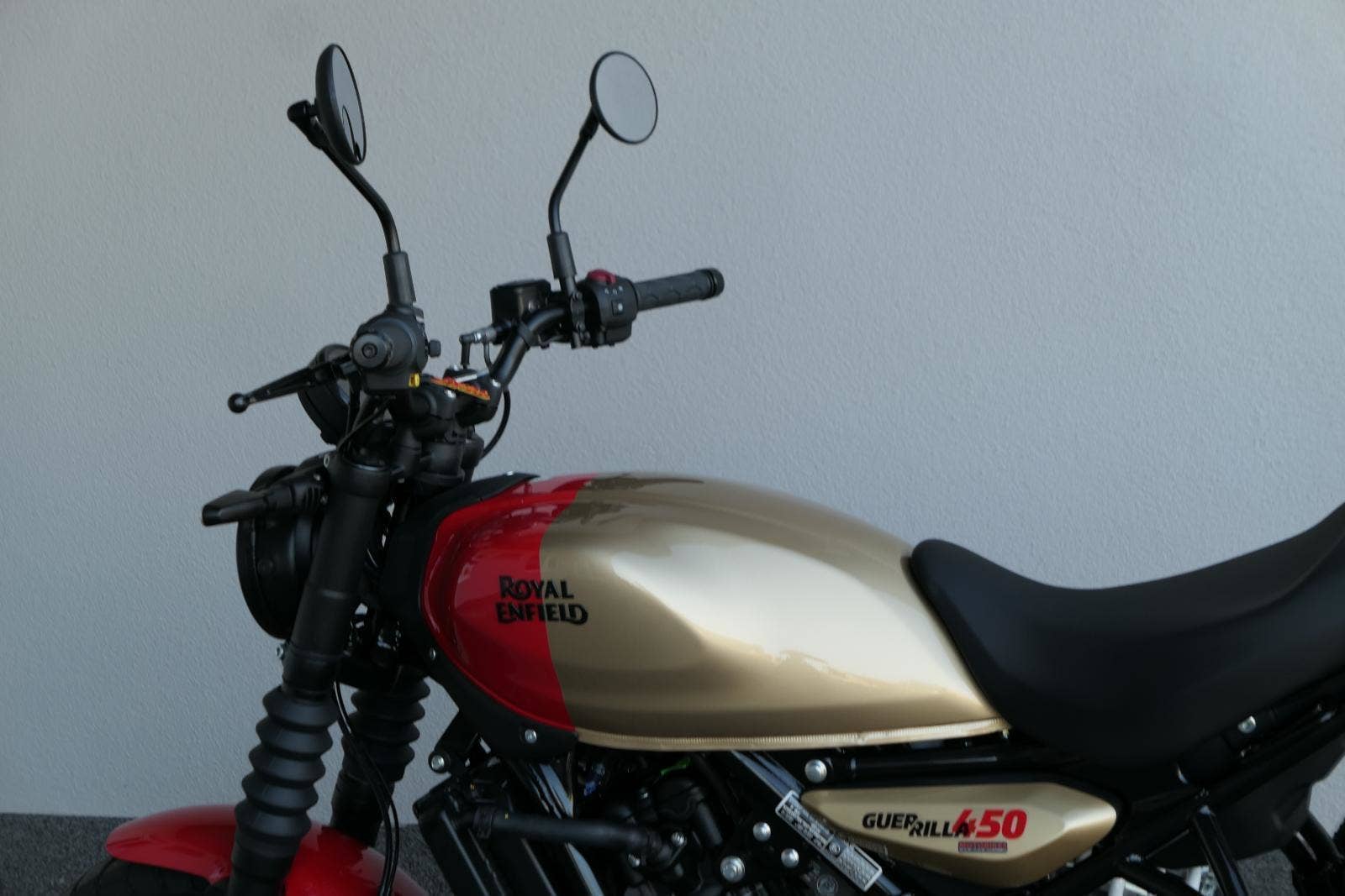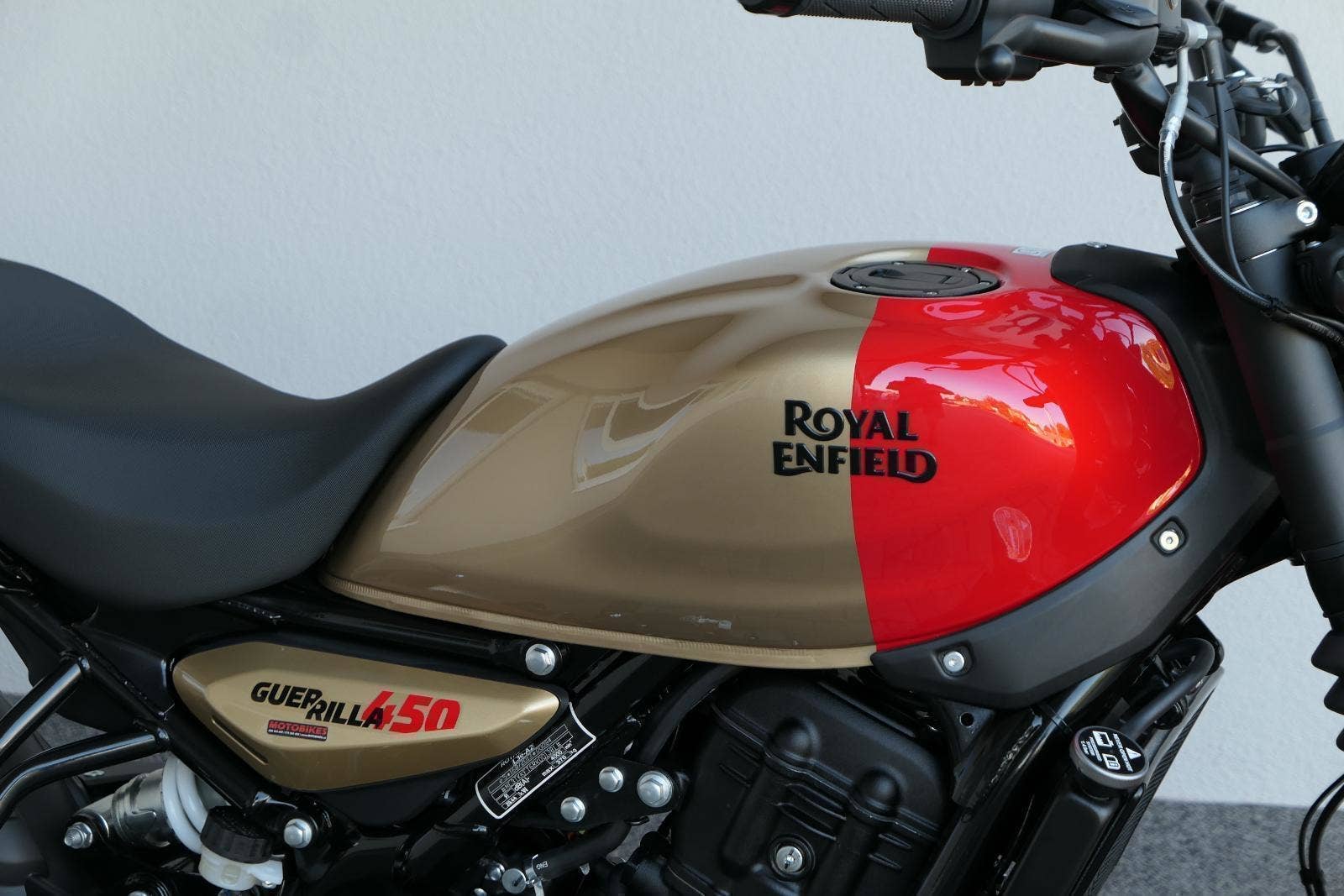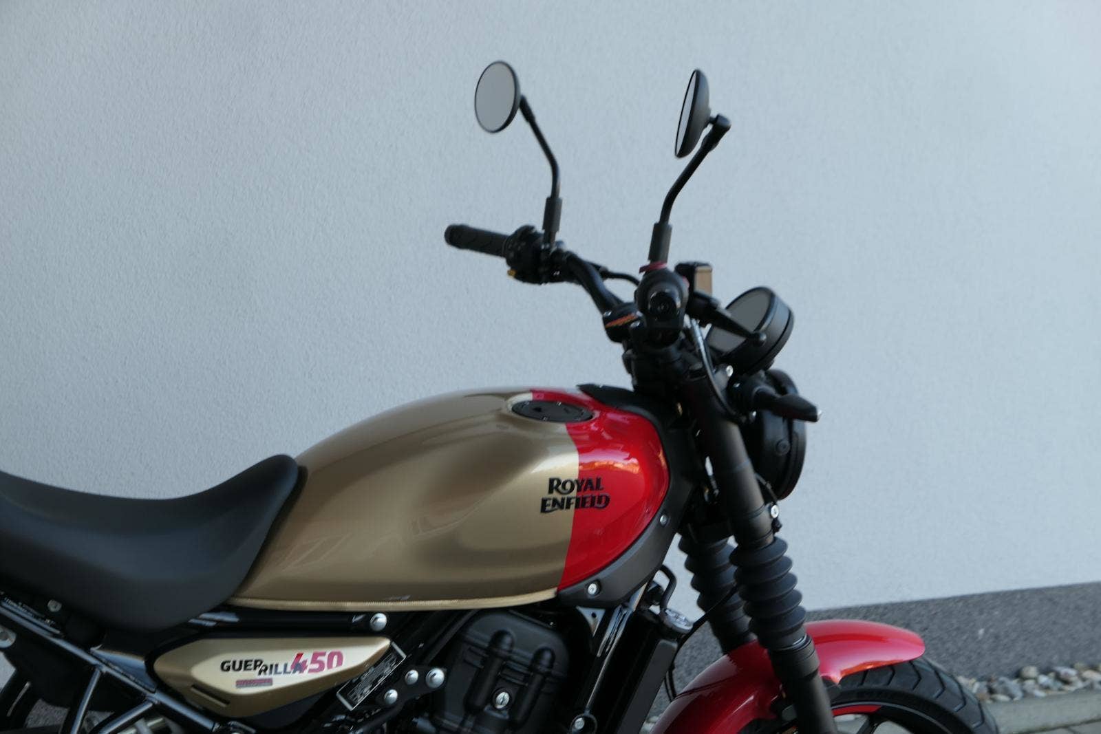 Z dosavadní modelové řady má Guerilla nejblíž Hunteru, působí ale moderněji a má i výrazně modernější techniku. Tak jako u aktuálního silnějšího Himalayanu 450 tvoří základ motorky trubkový páteřový rám, a v něm jako nosný prvek kapalinou chlazený jednoválec Sherpa o objemu 452 cm3. Relativně nový čtyřventil je mnohem výkonnější jednotkou než starší a menší vzduchem chlazené agregáty. Konkrétně nabídne rovných 40 koní v 8 000 otáčkách, a aby se to dobře pamatovalo tak i 40 Nm, které vrcholí v 5 500 otáčkách. Motor už má elektronický plyn a díky tomu i volitelné jízdní režimy – je ale poměrně jasné, který z dvojice „Eco“ a „Performance“ drtivá většina jezdců zvolí.