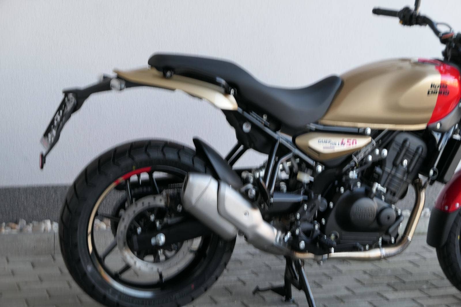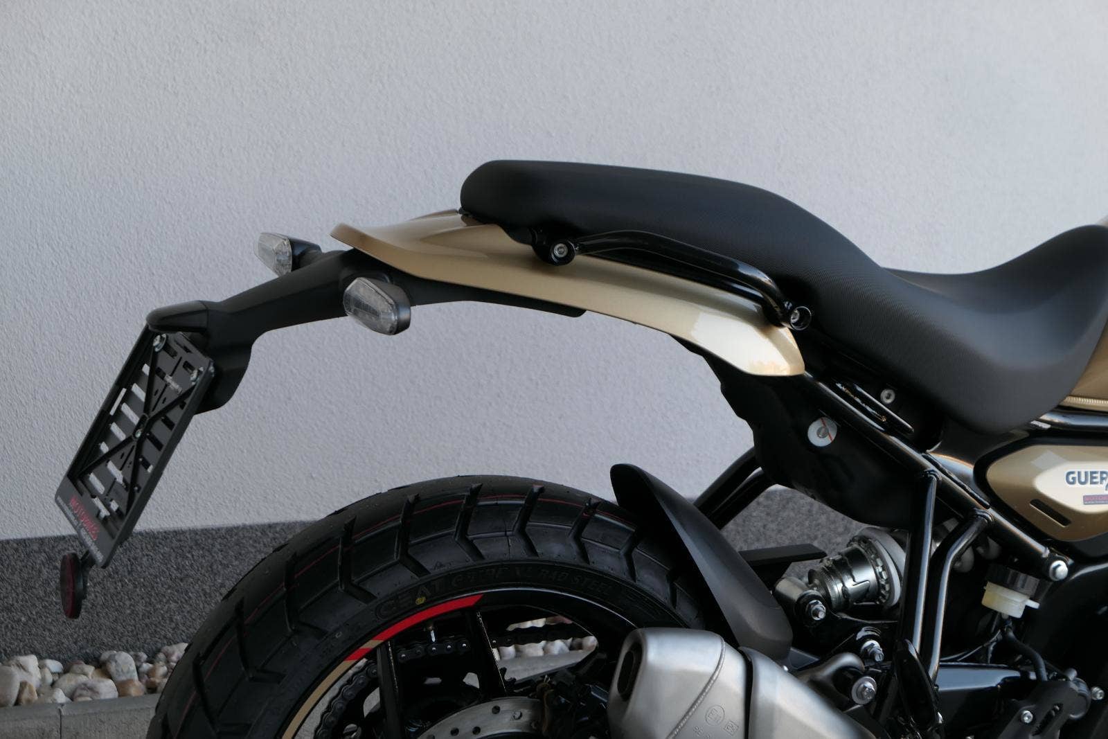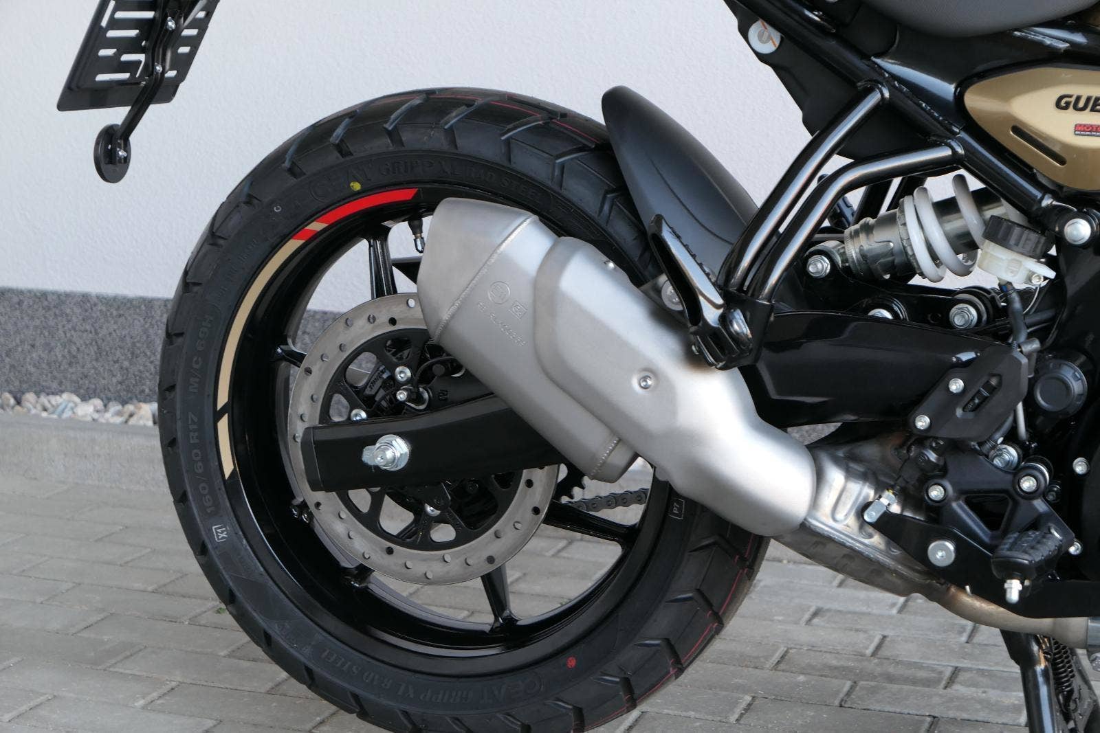 Kola jsou sedmnáctipalcová a Guerilla se chlubí přístupnou výškou sedla 780 milimetrů, stejně jako příjemnou pohotovostní hmotností 184 kilogramů. S ohledem na výkon a hmotnost jsou celkem dostačující i brzdy – vpředu jeden kotouč 310 milimetrů s dvoupístkovým brzdičem, vzadu 270 milimetrů s jednopístem. Do nádrže se vejde jenom skromných 11 litrů, na druhou stranu výrobce uvádí i skromnou tabulkovou spotřebu 3,39 litru na 100 kilometrů.