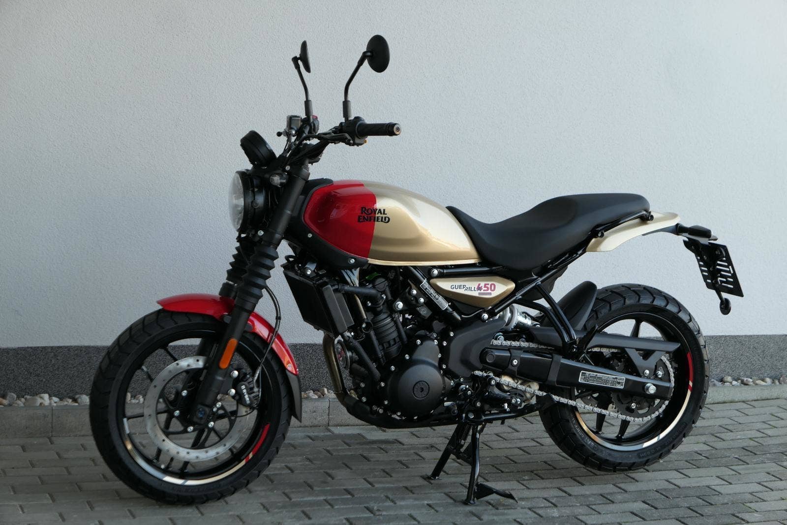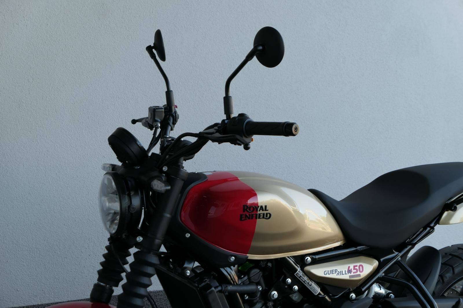 Royal Enfield Guerrilla 450 sdílí motor a technický základ s cestovním endurem Himalayan 450, stojí ale na malých silničních kolech a místo cestování míří na každodenní dojíždění, i na radovánky okolo komína.
