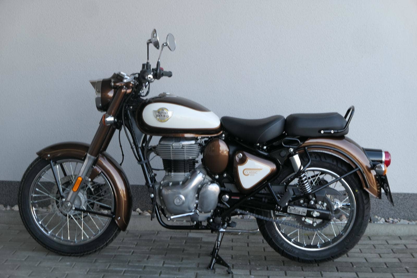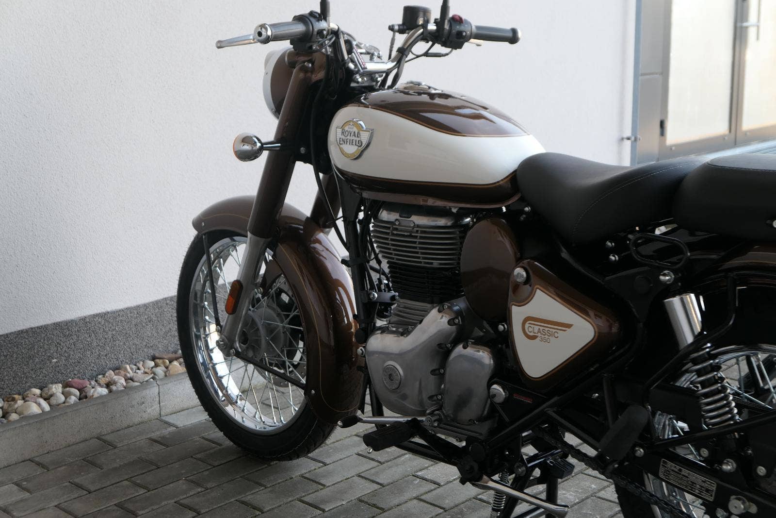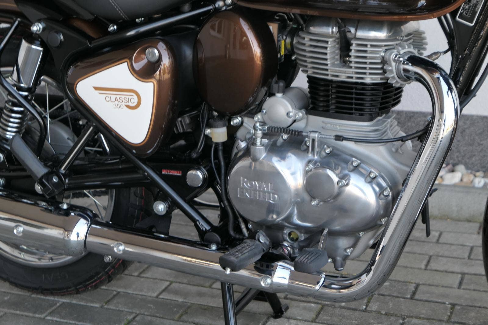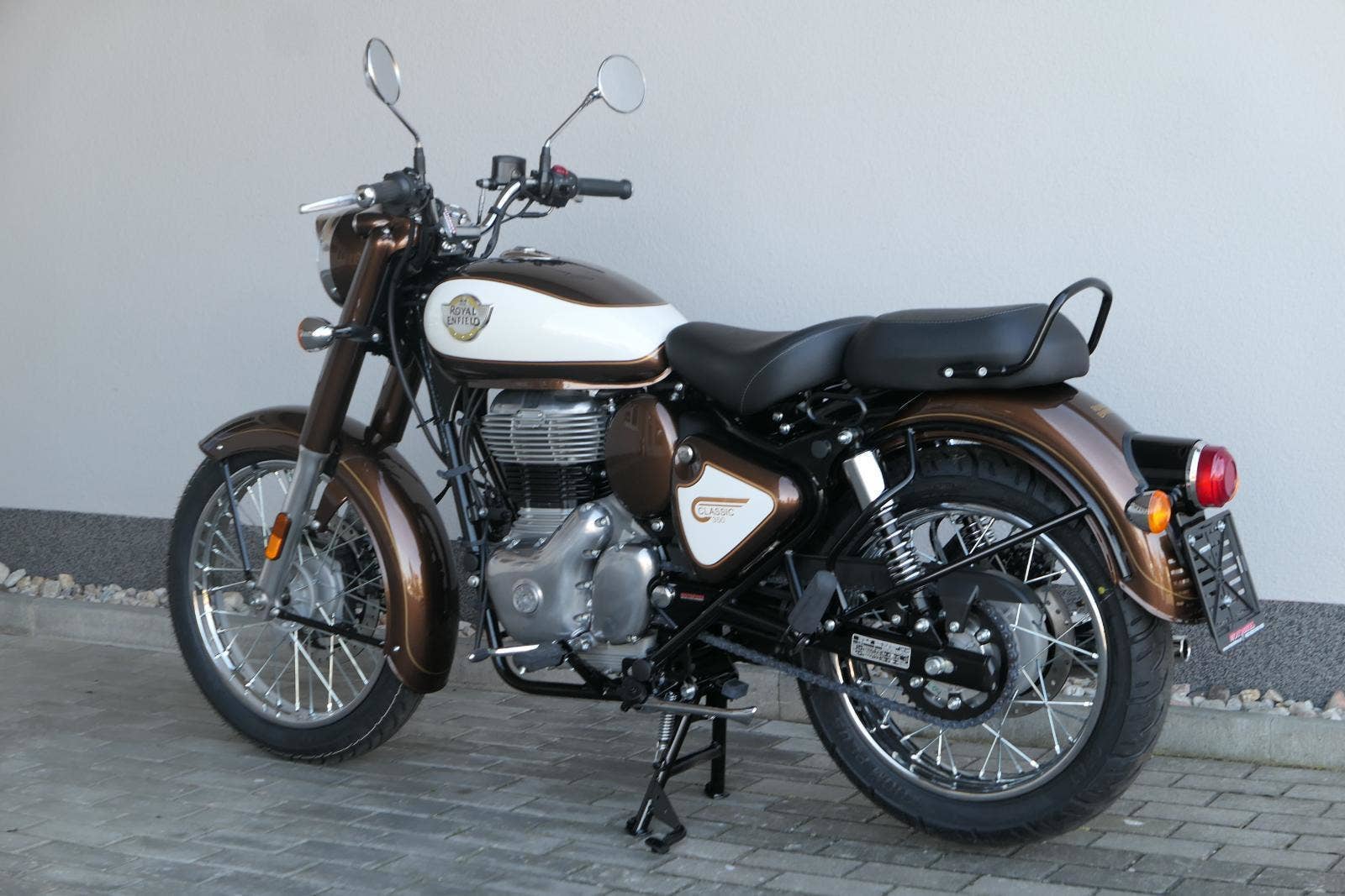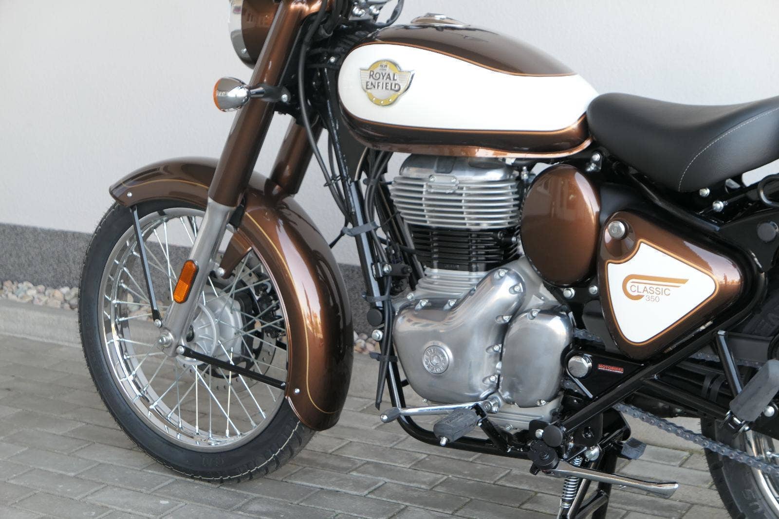 Ústředním prvkem nového Classic 350 je zcela nové srdce, které bije do jedinečného rytmu Royal Enfield. Ve spojení s novým rámem se dvěma spodními trubkami, který jezdí pevně a věrně, solidní a spolehlivou kvalitou konstrukce, je Classic vaším spojencem, ať už je váš cíl kdekoliv. Vzpřímená jízdní poloha dává jezdci Classicu vynikající vzhled na silnici, zatímco brzdy s větším průměrem zvyšují jeho brzdnou sílu. Ale silnější neznamená jen schopný a odolný, Classic je obdařen také pohodlím, s vylepšeným širším sedlem, které zpříjemňuje jízdu.