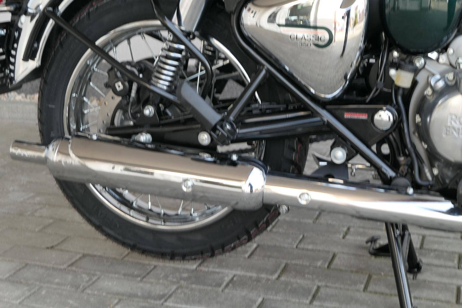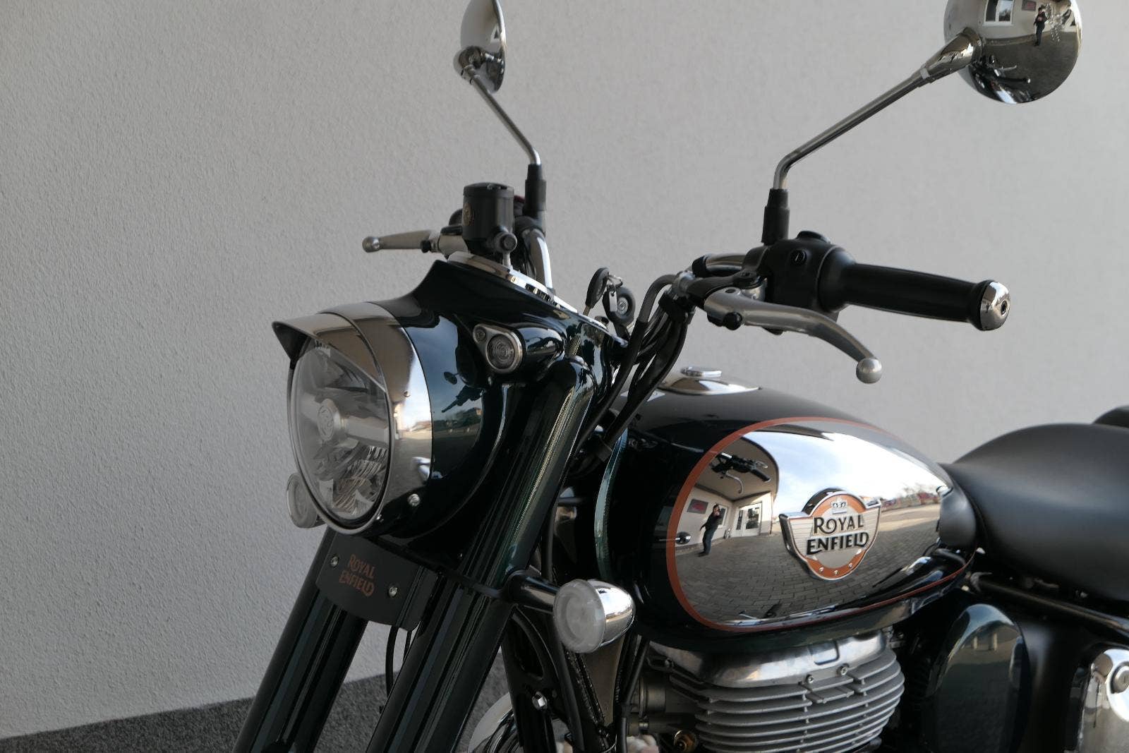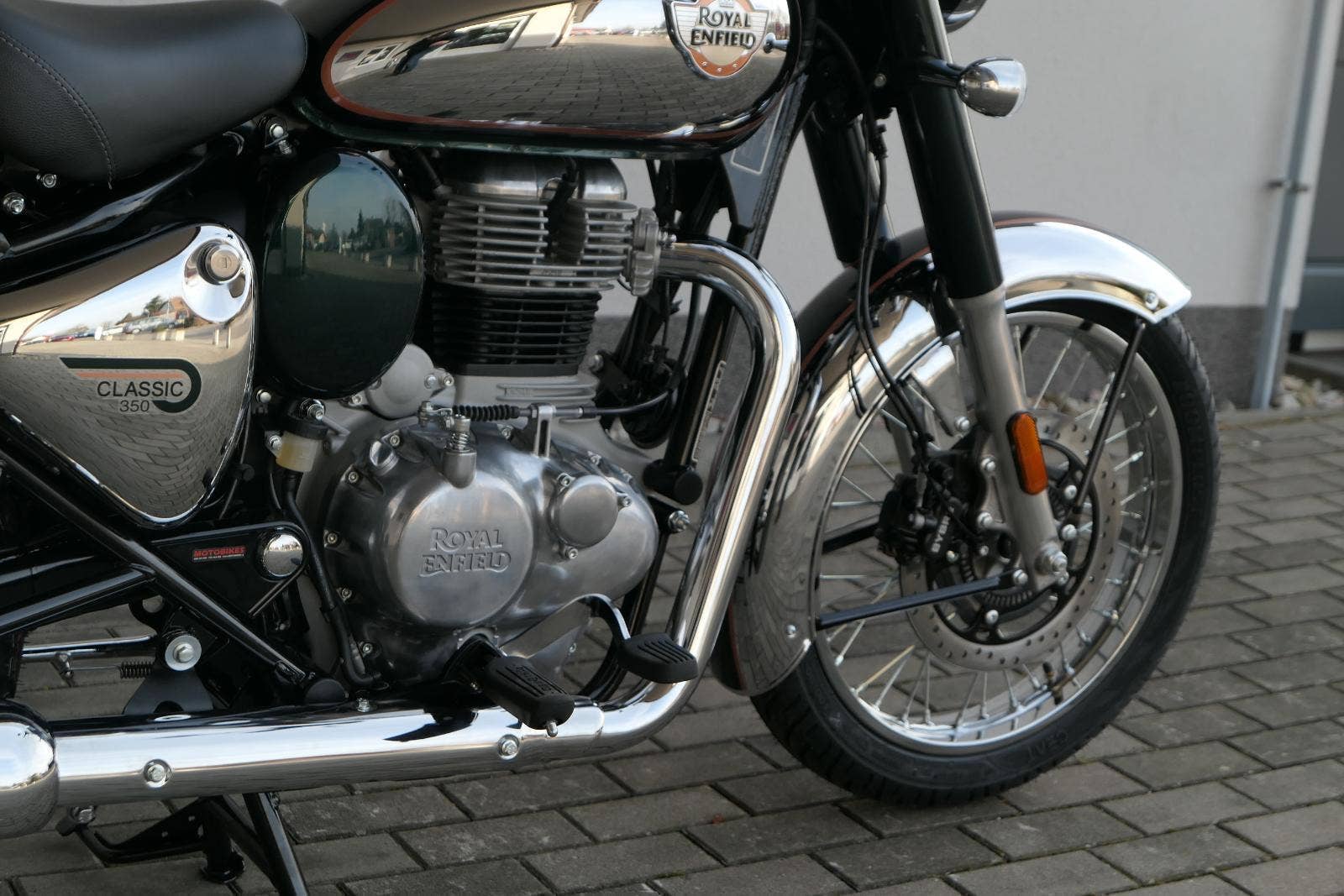 Ústředním prvkem nového Classic 350 je zcela nové srdce, které bije do jedinečného rytmu Royal Enfield. Ve spojení s novým rámem se dvěma spodními trubkami, který jezdí pevně a věrně, solidní a spolehlivou kvalitou konstrukce, je Classic vaším spojencem, ať už je váš cíl kdekoliv. Vzpřímená jízdní poloha dává jezdci Classicu vynikající vzhled na silnici, zatímco brzdy s větším průměrem zvyšují jeho brzdnou sílu. Ale silnější neznamená jen schopný a odolný, Classic je obdařen také pohodlím, s vylepšeným širším sedlem, které zpříjemňuje jízdu.