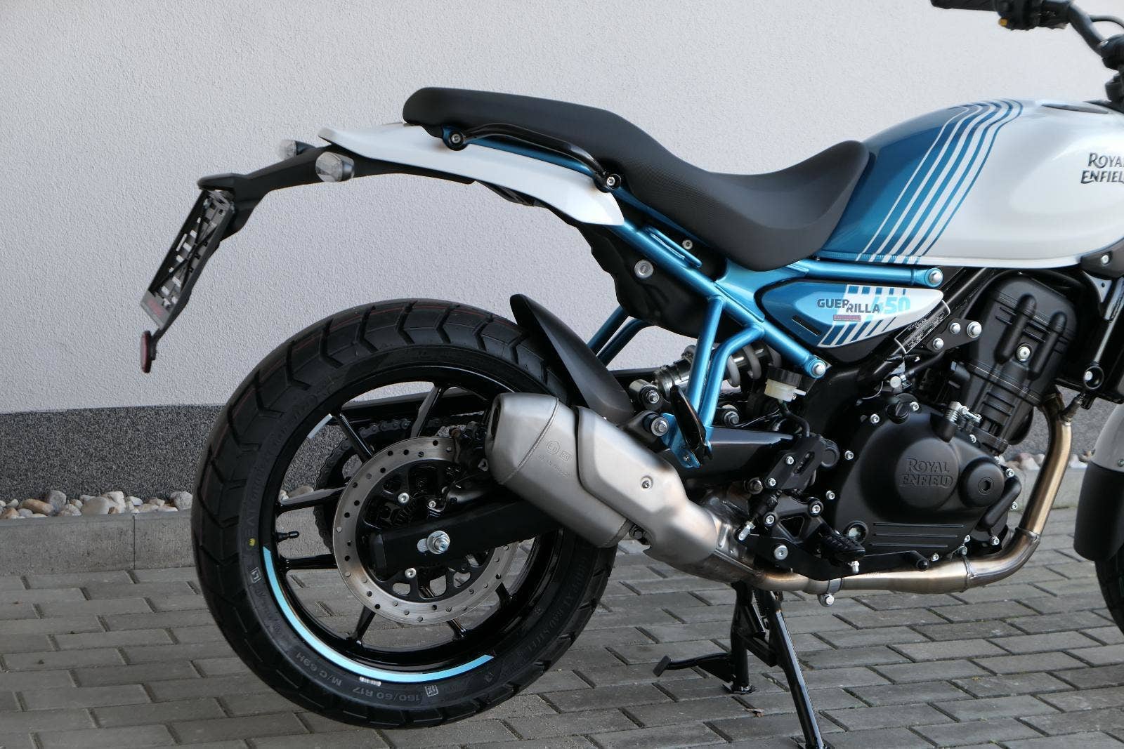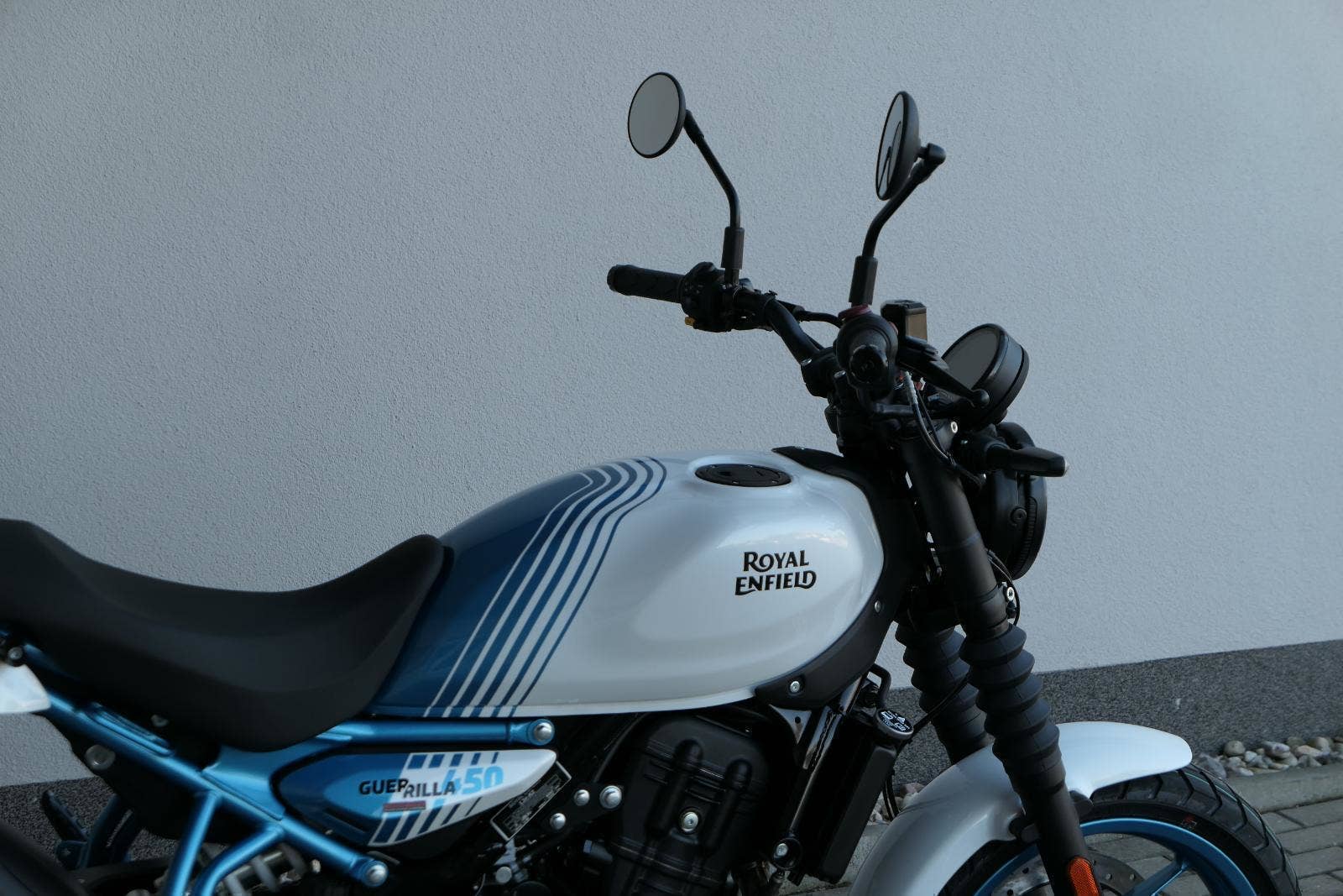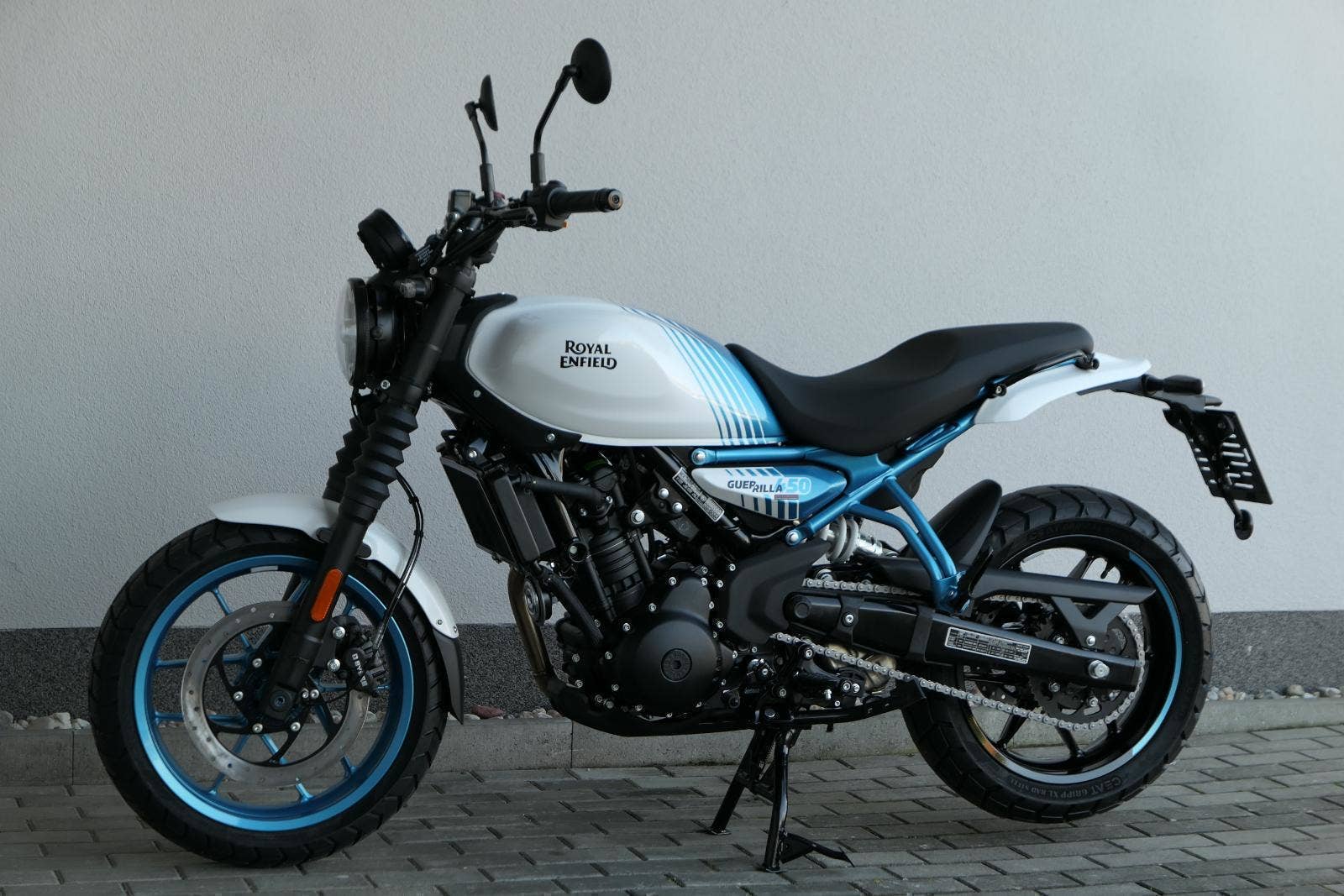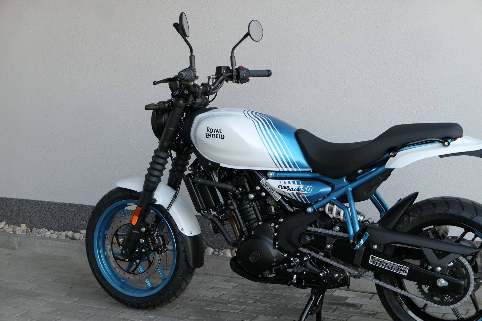 Royal Enfield Guerrilla 450 sdílí motor a technický základ s cestovním endurem Himalayan 450, stojí ale na malých silničních kolech a místo cestování míří na každodenní dojíždění, i na radovánky okolo komína.