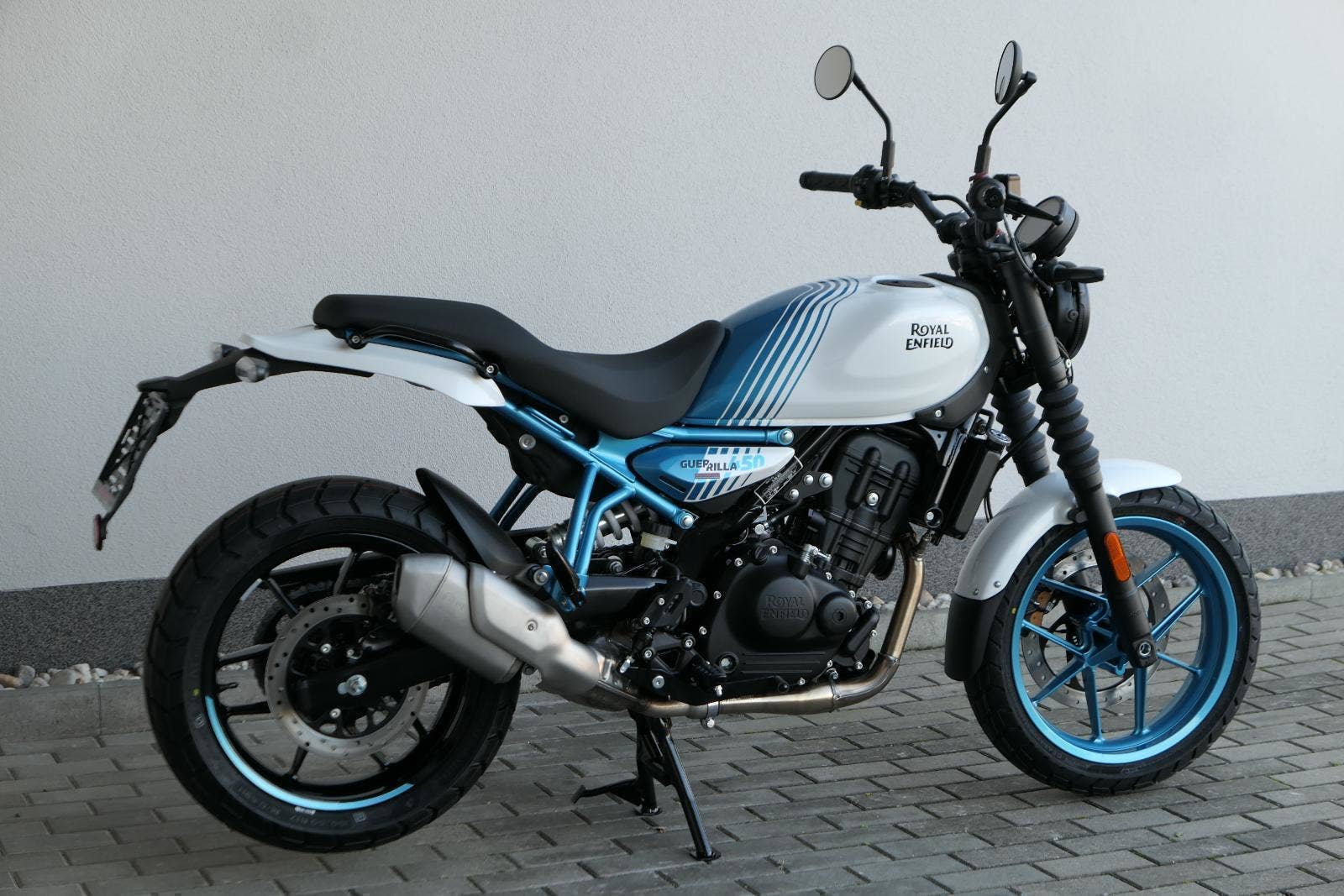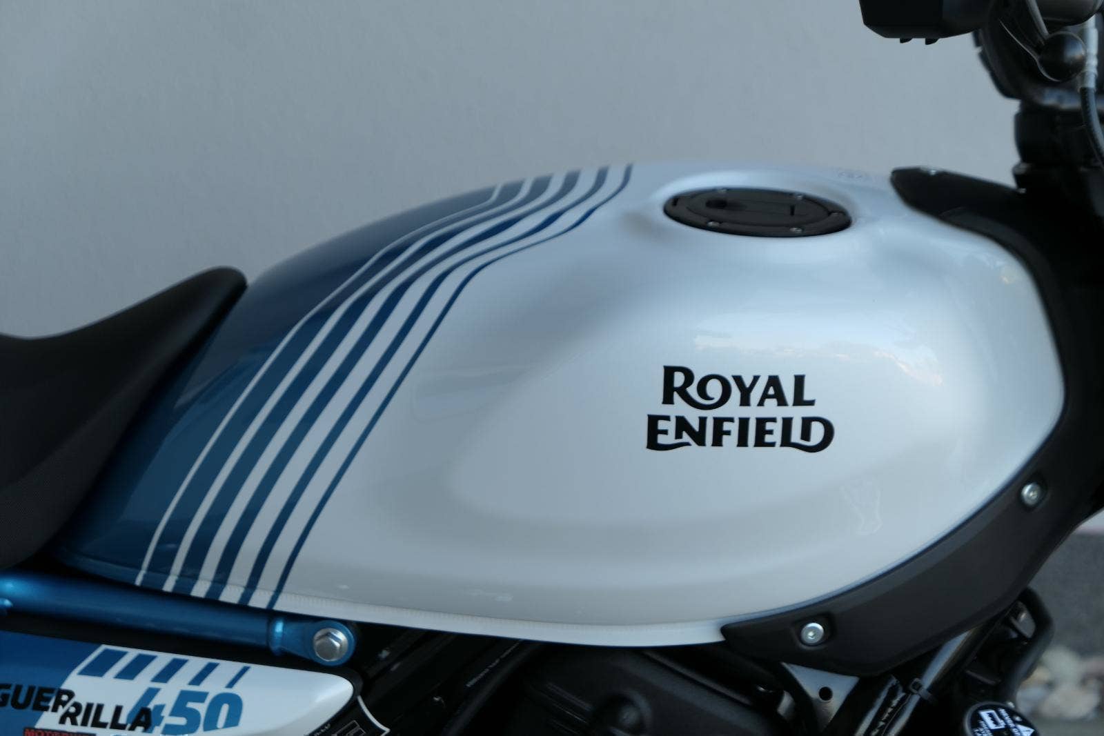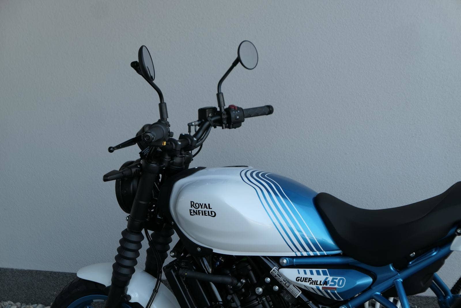 Royal Enfield Guerrilla 450 sdílí motor a technický základ s cestovním endurem Himalayan 450, stojí ale na malých silničních kolech a místo cestování míří na každodenní dojíždění, i na radovánky okolo komína.