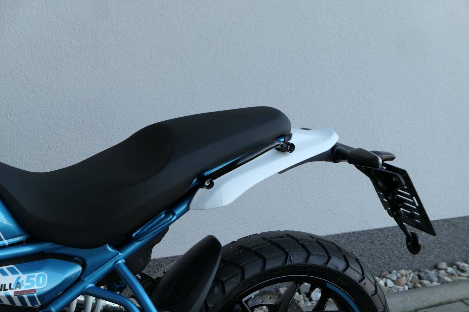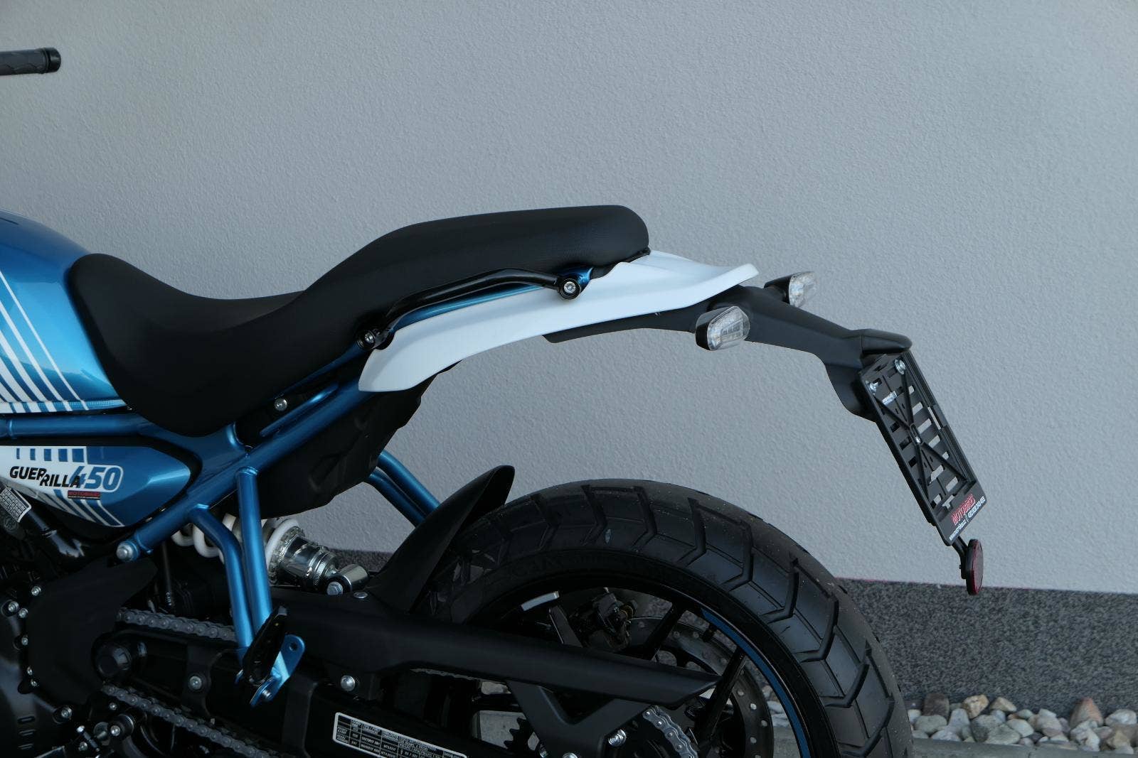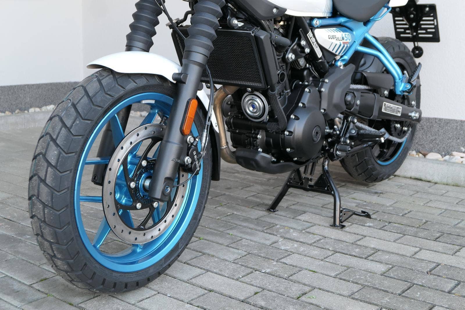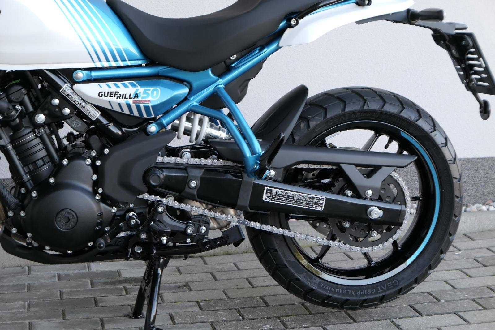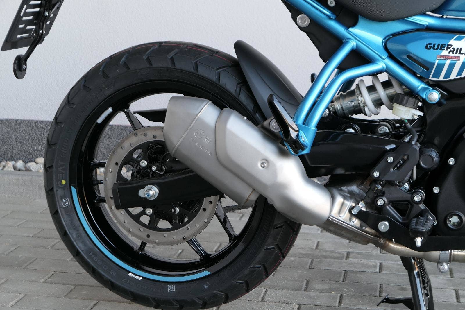Kola jsou sedmnáctipalcová a Guerilla se chlubí přístupnou výškou sedla 780 milimetrů, stejně jako příjemnou pohotovostní hmotností 184 kilogramů. S ohledem na výkon a hmotnost jsou celkem dostačující i brzdy – vpředu jeden kotouč 310 milimetrů s dvoupístkovým brzdičem, vzadu 270 milimetrů s jednopístem. Do nádrže se vejde jenom skromných 11 litrů, na druhou stranu výrobce uvádí i skromnou tabulkovou spotřebu 3,39 litru na 100 kilometrů.