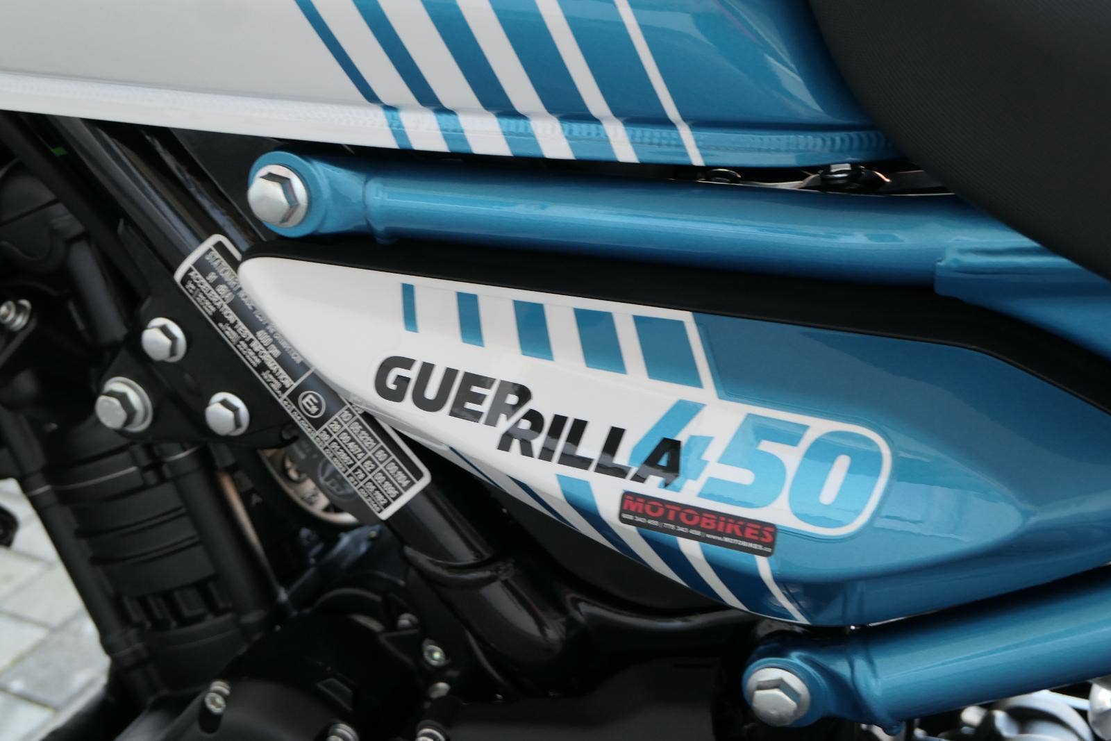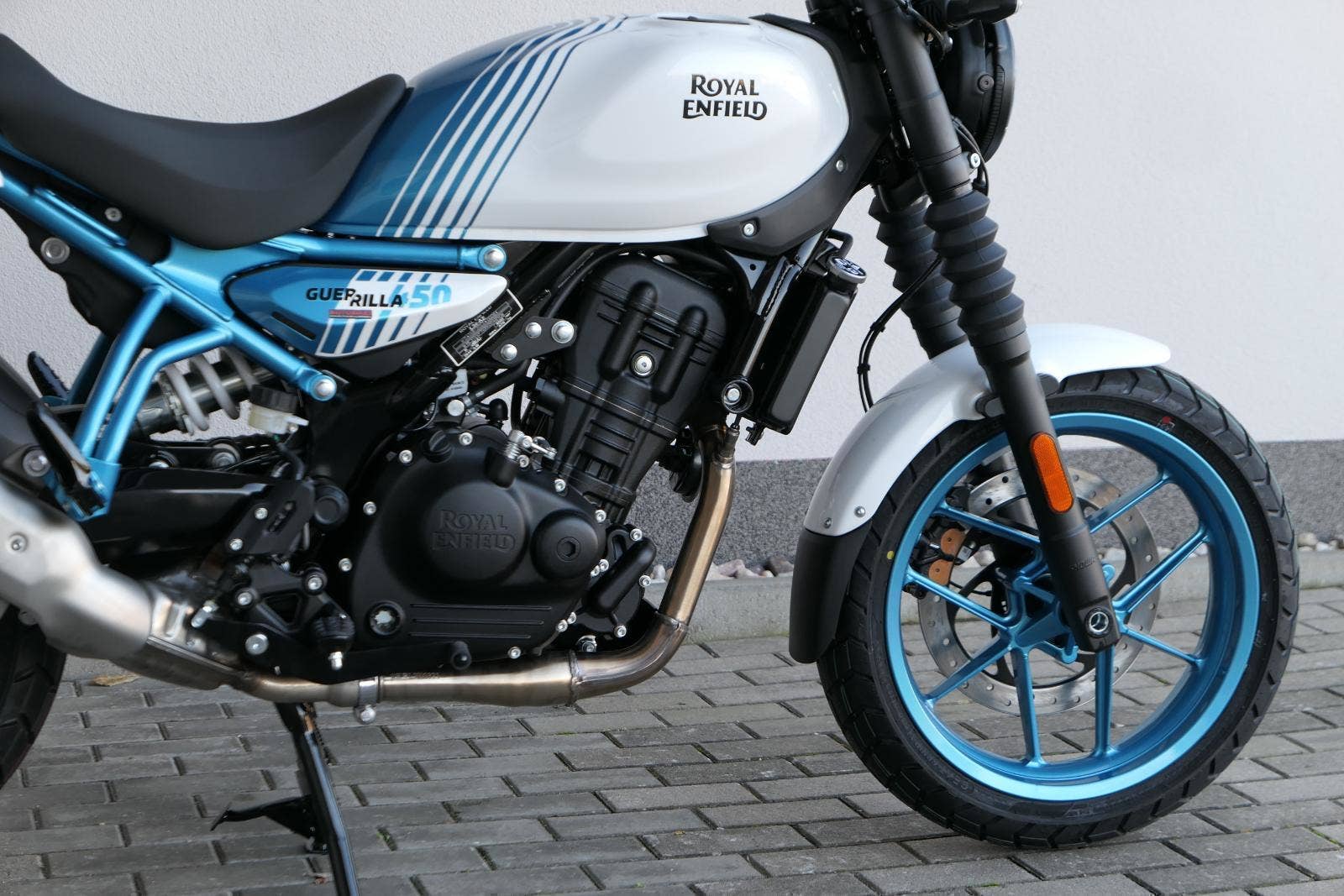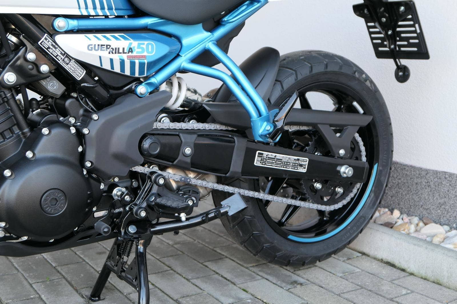 Z dosavadní modelové řady má Guerilla nejblíž Hunteru, působí ale moderněji a má i výrazně modernější techniku. Tak jako u aktuálního silnějšího Himalayanu 450 tvoří základ motorky trubkový páteřový rám, a v něm jako nosný prvek kapalinou chlazený jednoválec Sherpa o objemu 452 cm3. Relativně nový čtyřventil je mnohem výkonnější jednotkou než starší a menší vzduchem chlazené agregáty. Konkrétně nabídne rovných 40 koní v 8 000 otáčkách, a aby se to dobře pamatovalo tak i 40 Nm, které vrcholí v 5 500 otáčkách. Motor už má elektronický plyn a díky tomu i volitelné jízdní režimy – je ale poměrně jasné, který z dvojice „Eco“ a „Performance“ drtivá většina jezdců zvolí.