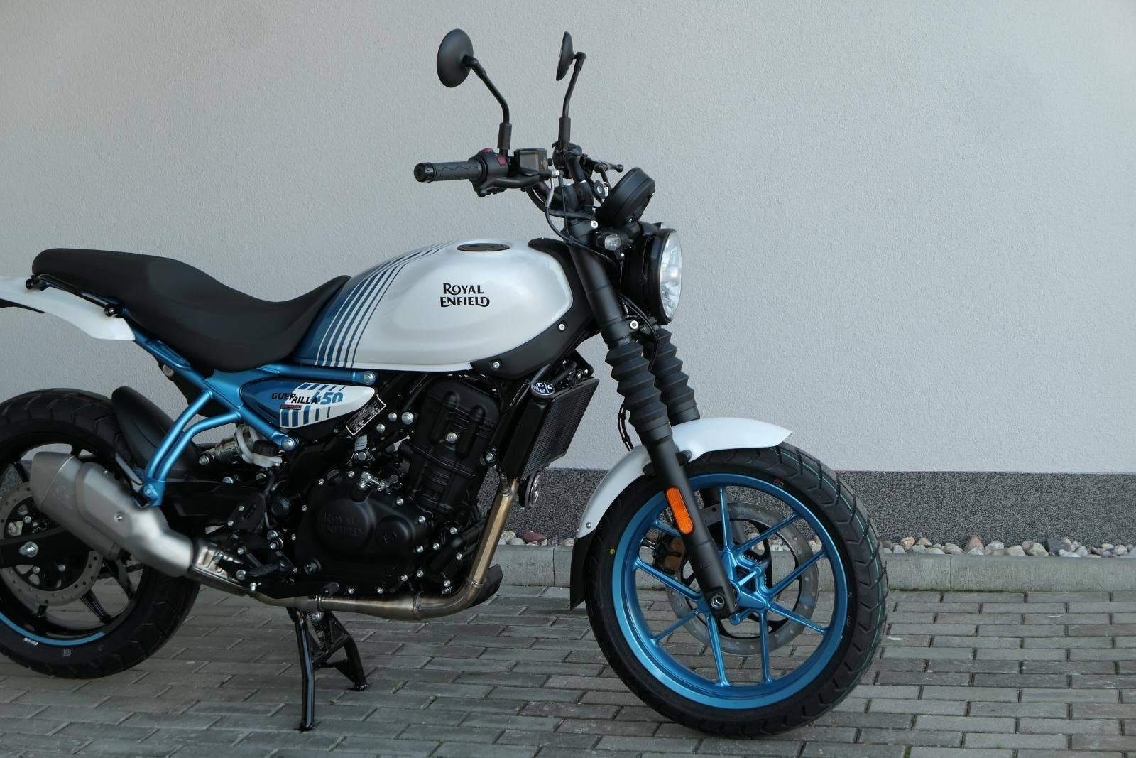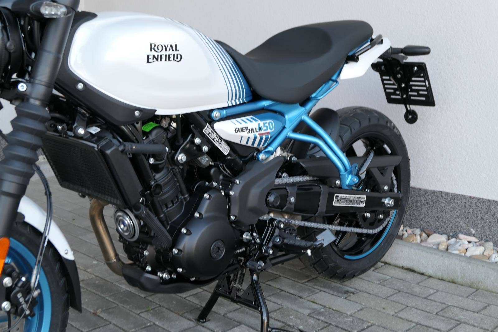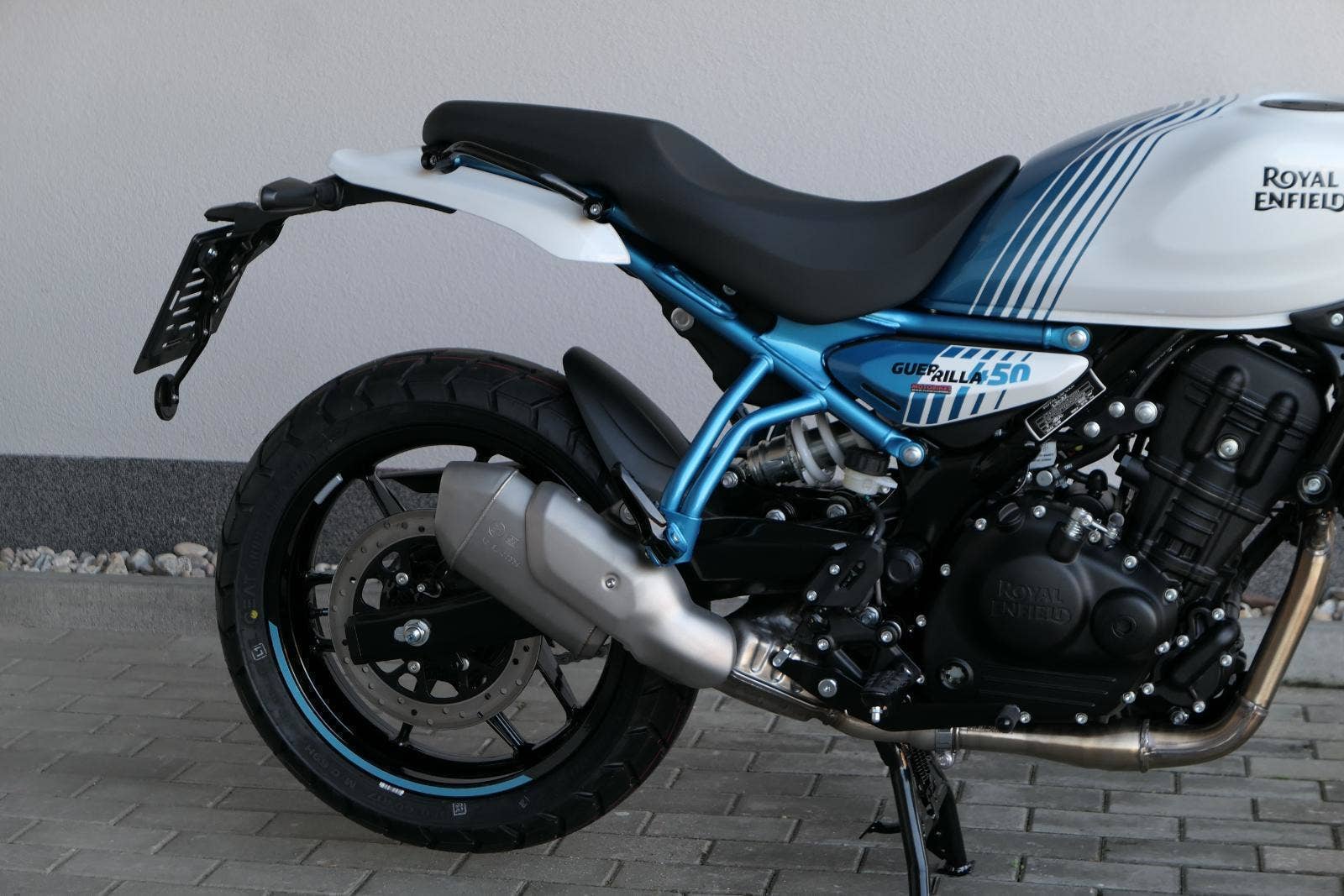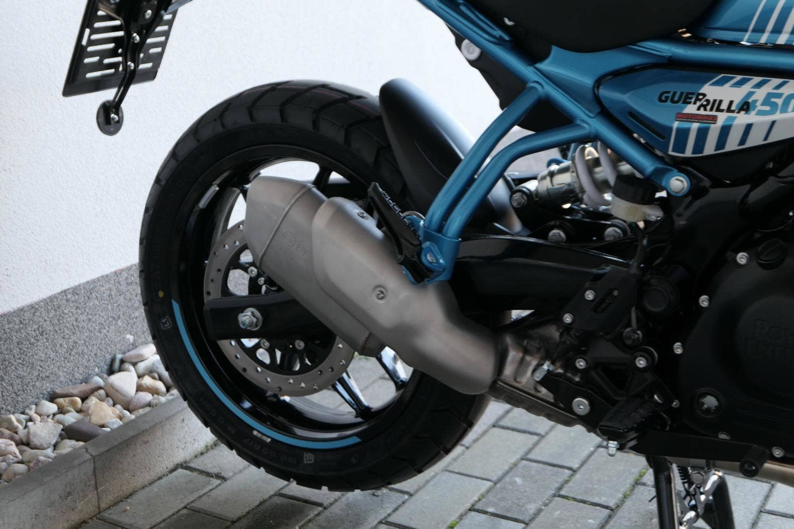 Z dosavadní modelové řady má Guerilla nejblíž Hunteru, působí ale moderněji a má i výrazně modernější techniku. Tak jako u aktuálního silnějšího Himalayanu 450 tvoří základ motorky trubkový páteřový rám, a v něm jako nosný prvek kapalinou chlazený jednoválec Sherpa o objemu 452 cm3. Relativně nový čtyřventil je mnohem výkonnější jednotkou než starší a menší vzduchem chlazené agregáty. Konkrétně nabídne rovných 40 koní v 8 000 otáčkách, a aby se to dobře pamatovalo tak i 40 Nm, které vrcholí v 5 500 otáčkách. Motor už má elektronický plyn a díky tomu i volitelné jízdní režimy – je ale poměrně jasné, který z dvojice „Eco“ a „Performance“ drtivá většina jezdců zvolí.