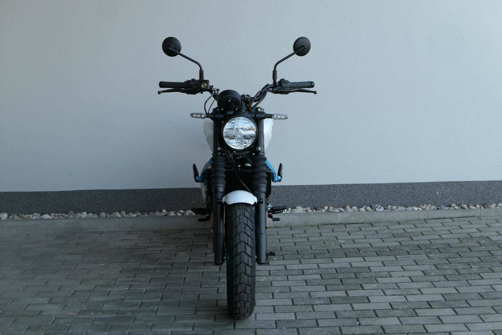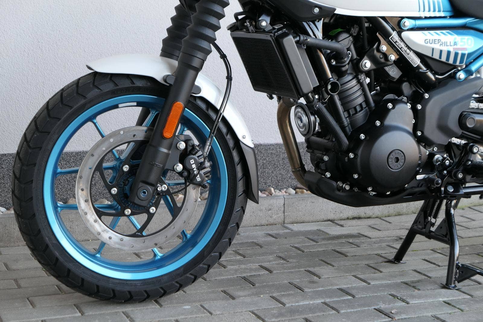 Na rozdíl od Himalayanu, nedělá si Guerrilla terénní ambice, byť některými prvky decentně připomíná, že je vlastně naháčo-scrambler – ve všech tiskových materiálech se pak objevuje populární termín „roadster“. Na teleskopických vidlicích jsou třeba prďácké retro prachovky, nicméně zdvih je jenom 140 milimetrů. Zadní vyosený centrál má potom 150 milimetrů.