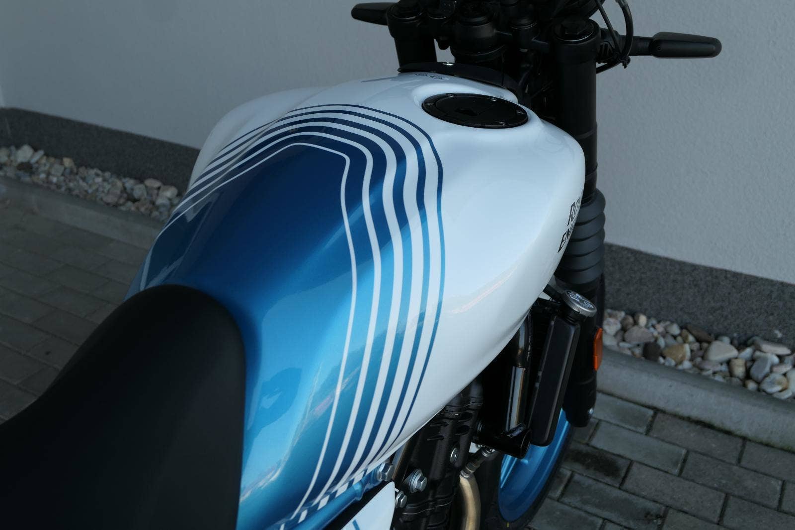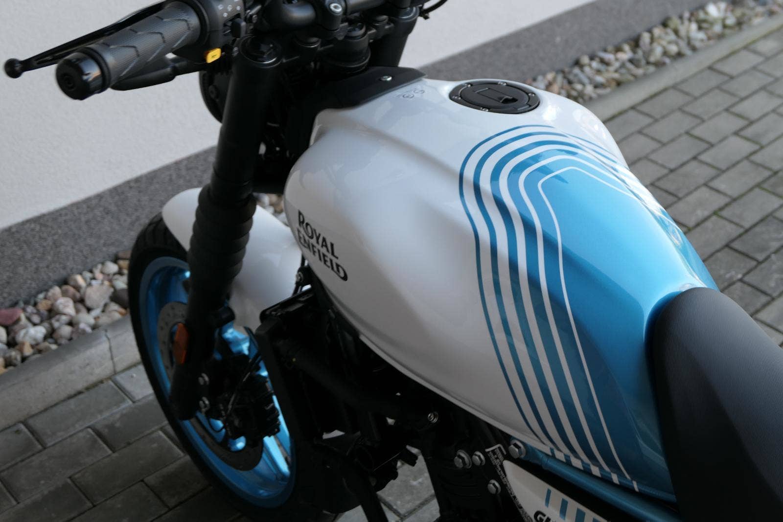 Celkově má Guerilla poměrně moderní tvary, Royal ale zdůrazňuje, že zde nejsou žádné nadbytečné plasty a serepetičky, a že jde v principu o jednoduchou a zábavnou motorku – což koneckonců spojuje všechny modely Royal Enfieldu. Opět je nutné pochválit výběr barev, který je vychytaný přesně tak, jak jsme u Royalu zvyklí. Z celkem pěti zbarvení je jenom jedno nudné, a sice jednolitá stříbrná Smoke Silver. Zbytek, tedy Brava Blue, Yellow Ribbon, Playa Black a Gold Dip zajímavě kombinují barevnou grafiku a ve třech případech dostanete i barevné ráfky.