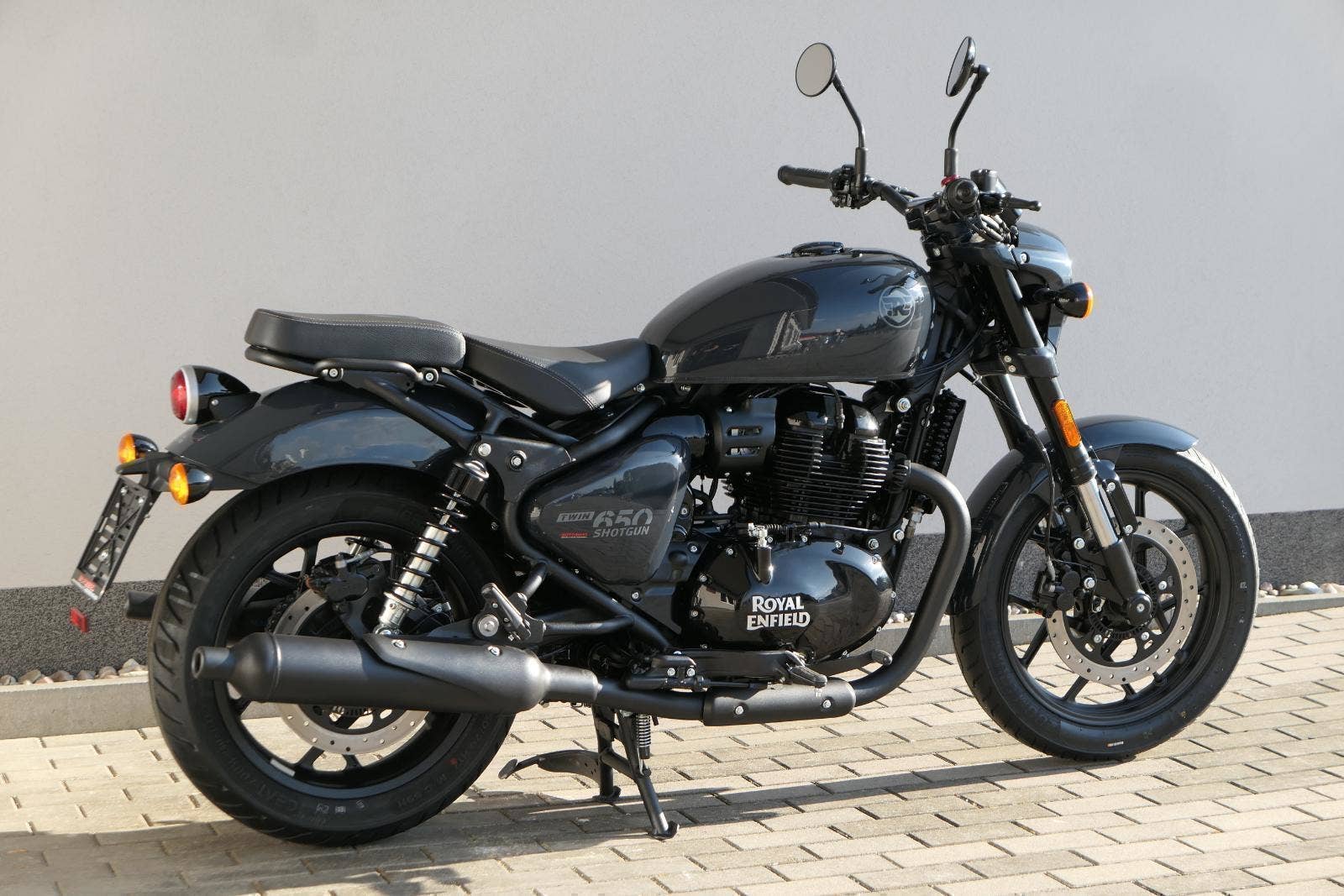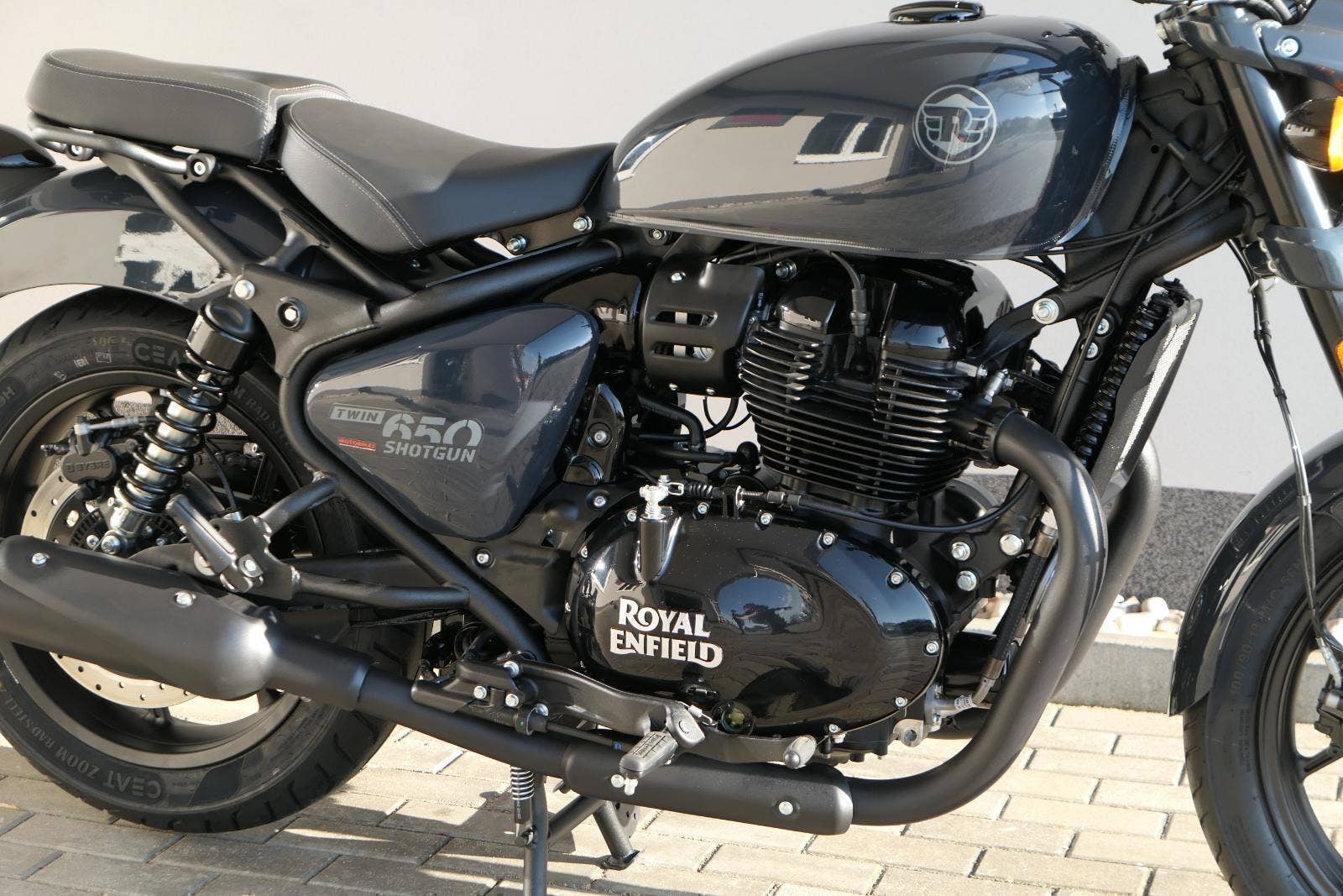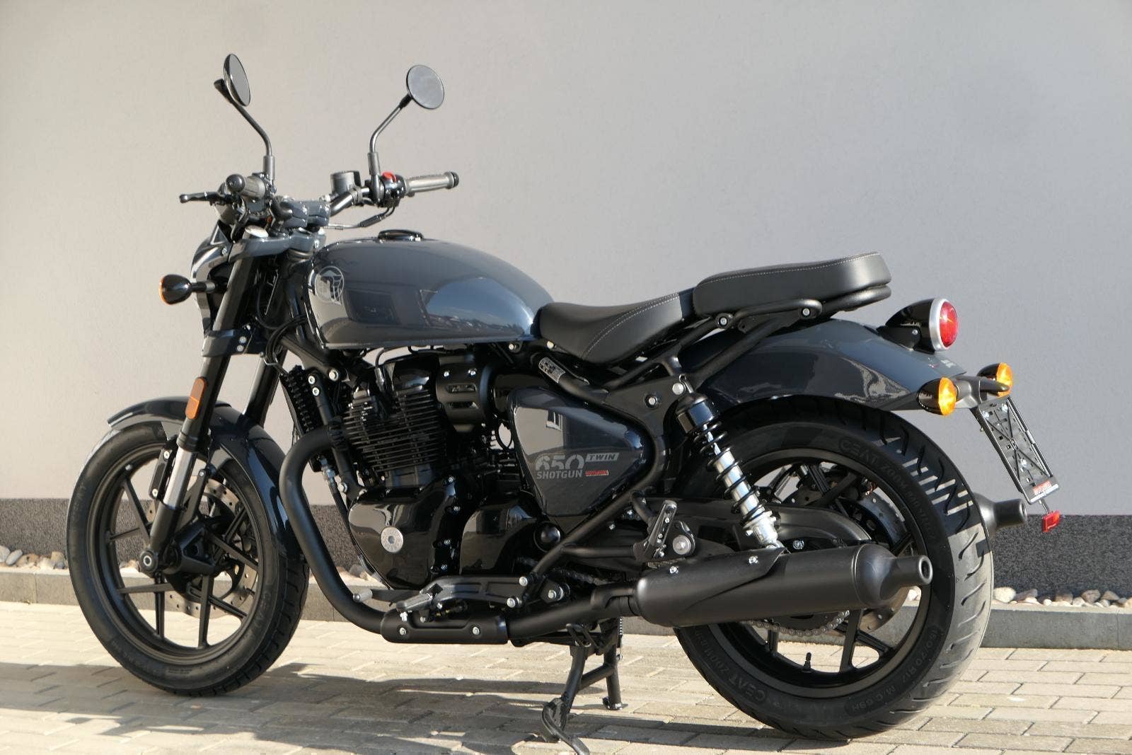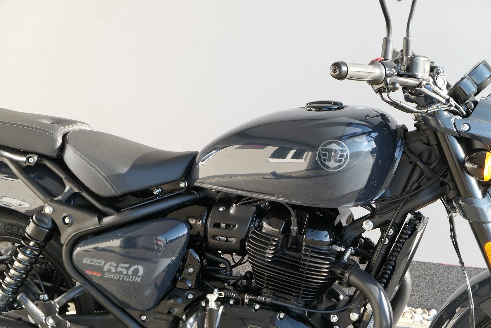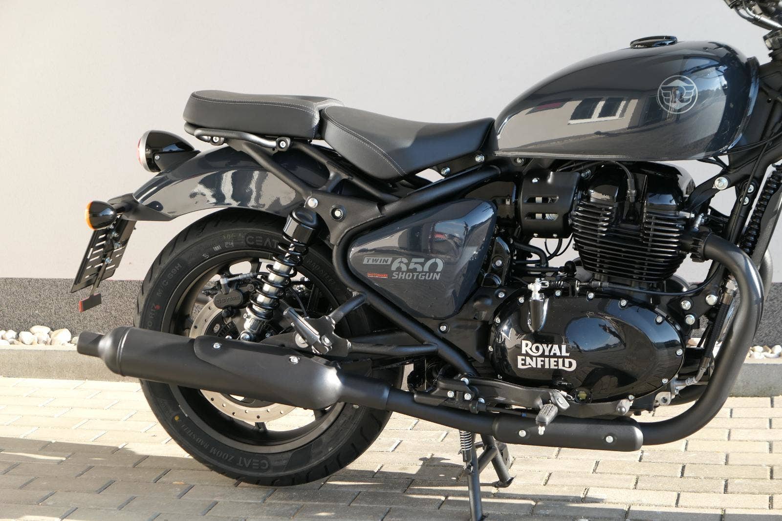 Nový Royal Enfield Shotgun 650 je motocykl, který je definován svým jezdcem. Jeho zcela nová karoserie a postoj jsou prázdným plátnem, které se vzpírá tradiční kategorizaci motocyklů a přebírá osobnost svého jezdce. Jeho modulární konstrukce umožňuje snadné přepínání mezi třemi režimy - od jednomístného přes dvoumístný až po cestovní vůz pro přepravu zavazadel. Otočením klíčku se odklopí sedadlo spolujezdce, což nabízí maximální flexibilitu. Těm, kteří hledají poutavou a agresivní jízdu, nebo těm, kteří hledají pohodovější zážitek, Shotgun 650 bez námahy vyhoví svou vzpřímenou a jistou jízdní pozicí, která podporuje obojí a přizpůsobuje se náladě a stylu jízdy jezdce. Kombinuje retro-futuristický design s moderními prvky. LED světlomet umístěný v nádherné neomoderní gondole na zakázku zůstává věrný estetice neo-retro fúze a zároveň nabízí lepší viditelnost. Motocykl je vybaven digitálně-analogovým sdruženým přístrojem, který je vybaven navigačním systémem Tripper a je navržen tak, aby poskytoval všechny informace, které potřebujete, když se vydáte na cestu. Je také vybaven nabíjecím portem USB, abyste měli svá zařízení na cestách stále nabitá.