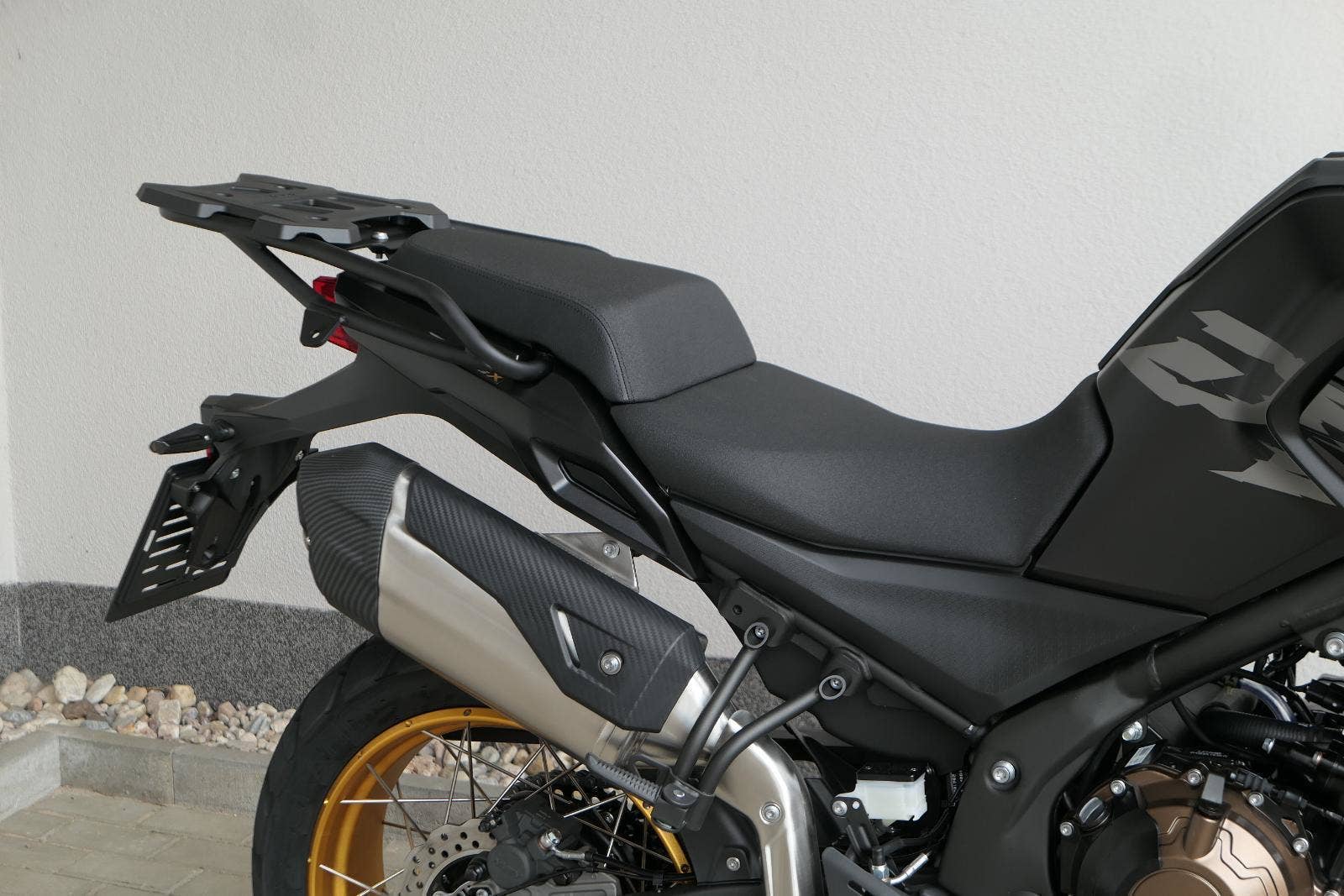 Těšit se můžeš taky na plexi, který si z místa řidiče bez nářadí nastavíš do dvou poloh. Oceníš i hliníkovej kryt motoru, LED světla včetně přídavnejch bodovek, boční i středovej stojan a hafo další výbavičky. Jo, a nově mám taky podsvícený ovladače na řídítkách, takže už žádný tápání ve tmě.