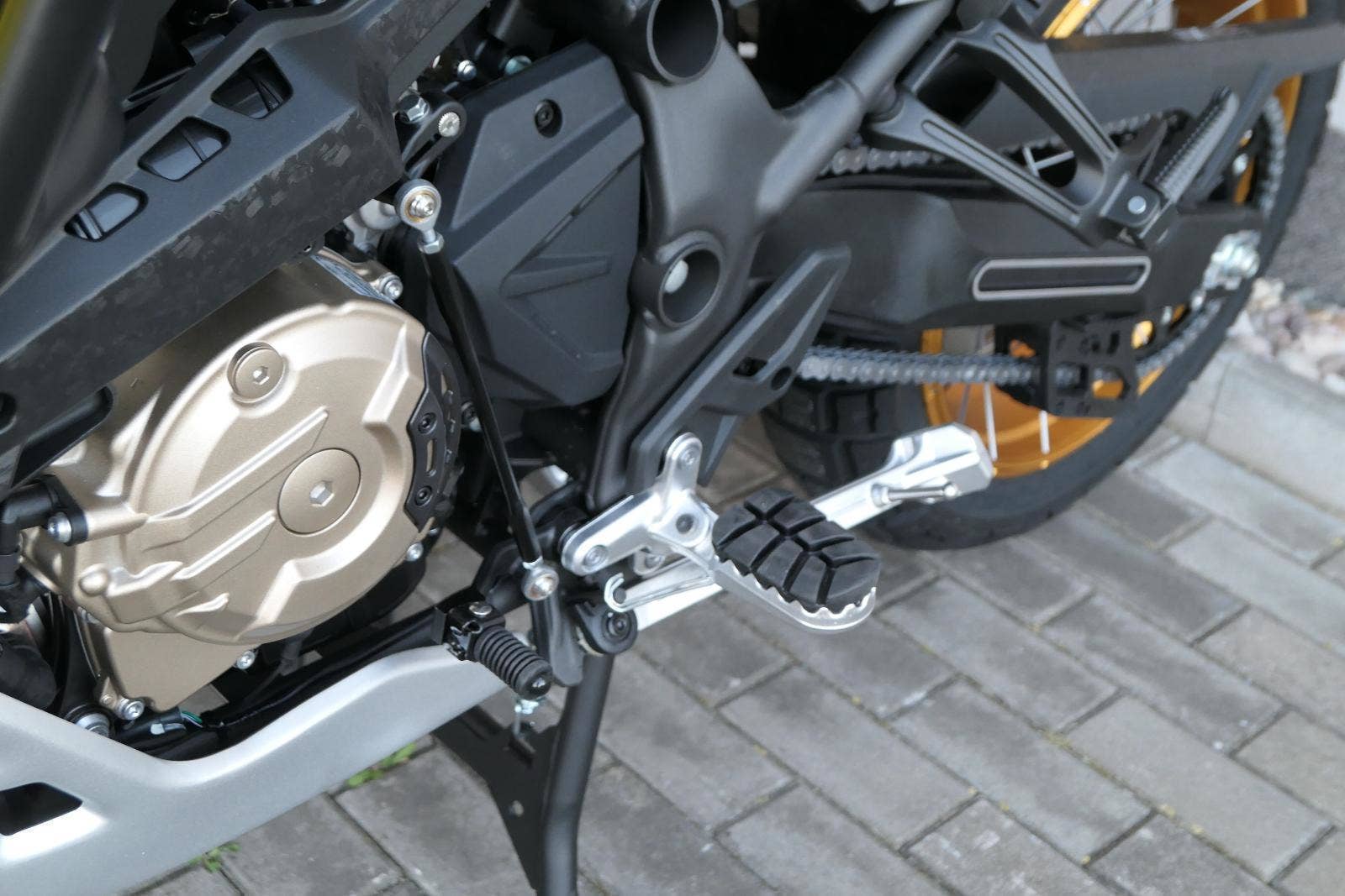 Můj štíhlej pas ti dovolí užít si jak jízdu vestoje, tak vsedě. Vysoký plexi mám fikaně posunutý dopředu, takže ti nebude mlátit do brady třeba při skocích. No a moje stupačky jsou nejen prostorný, ale samože taky zubatý, takže tě podržej v každý situaci.