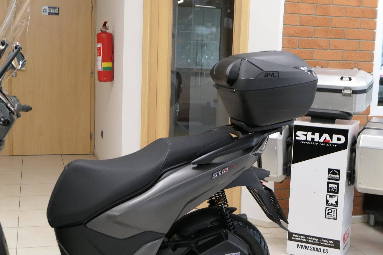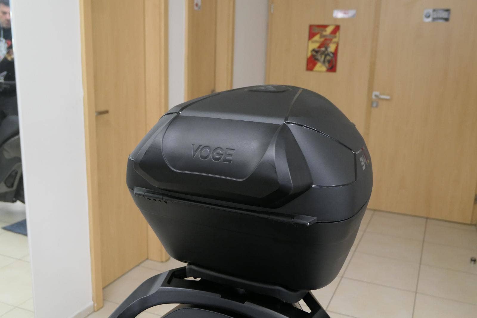 Pod sedlo hodíš běžnej nákup, případně jetku nebo menší integrálku. A kdybys vyrazil na větší nákup, už v základu dostaneš zadní hliníkovej nosič s 34litrovým kufrem. Drobnosti si schováš do uzavíratelný přihrádky s USB, kterou mám v předním štítu.