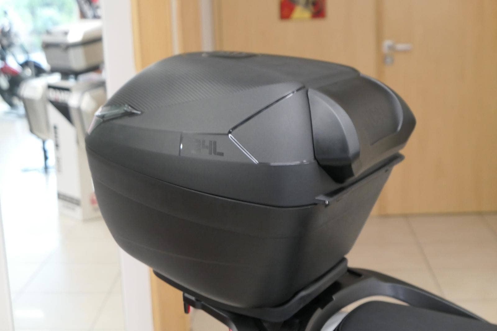 Pod sedlo hodíš běžnej nákup, případně jetku nebo menší integrálku. A kdybys vyrazil na větší nákup, už v základu dostaneš zadní hliníkovej nosič s 34litrovým kufrem. Drobnosti si schováš do uzavíratelný přihrádky s USB, kterou mám v předním štítu.