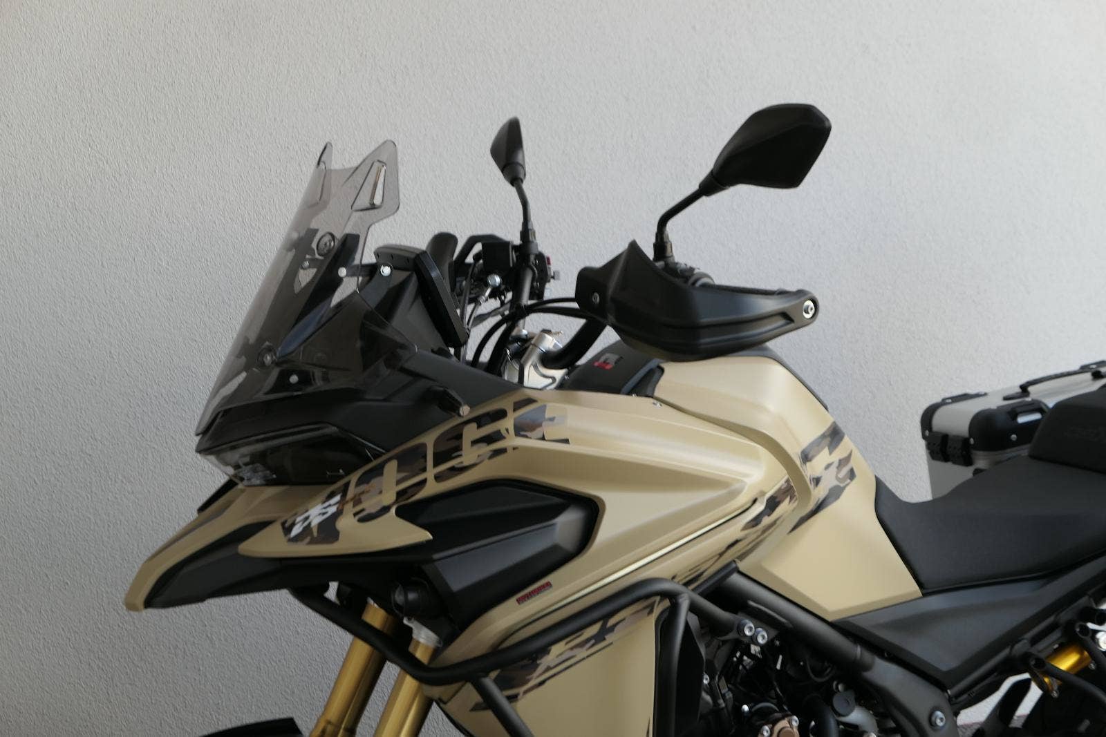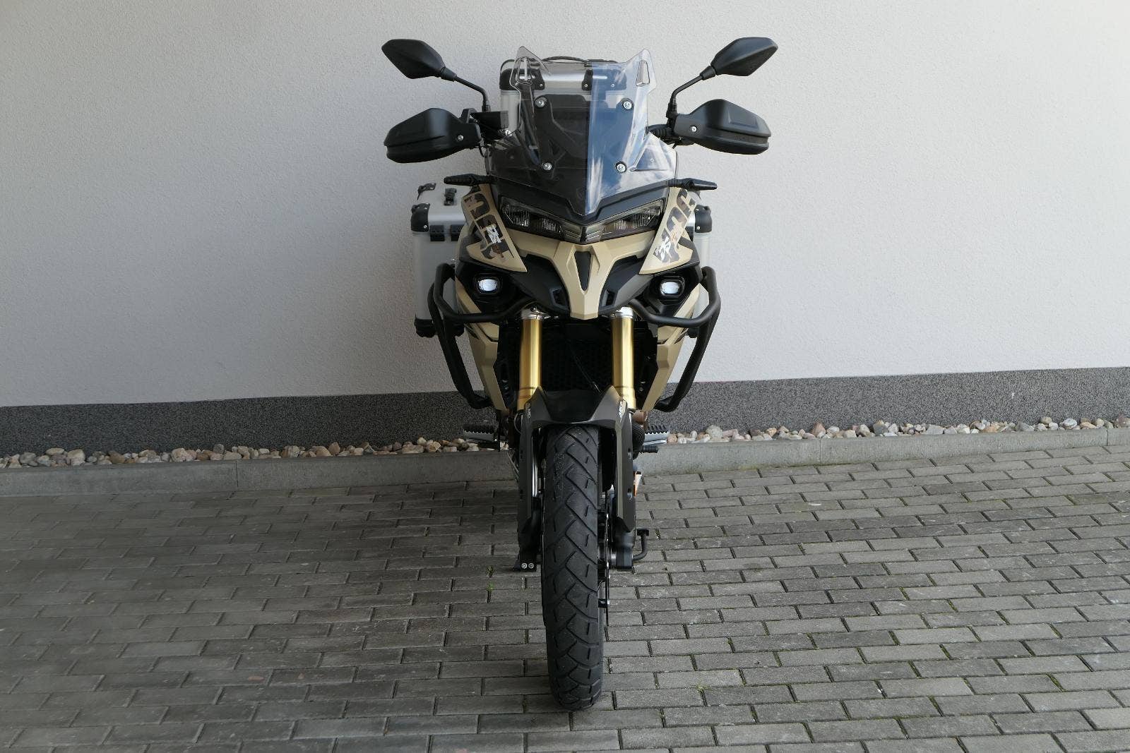 Těšit se můžeš taky na plexi, který si z místa řidiče bez nářadí nastavíš do dvou poloh. Oceníš i hliníkovej kryt motoru, LED světla včetně přídavnejch bodovek, boční i středovej stojan a hafo další výbavičky. Jo, a nově mám taky podsvícený ovladače na řídítkách, takže už žádný tápání ve tmě.