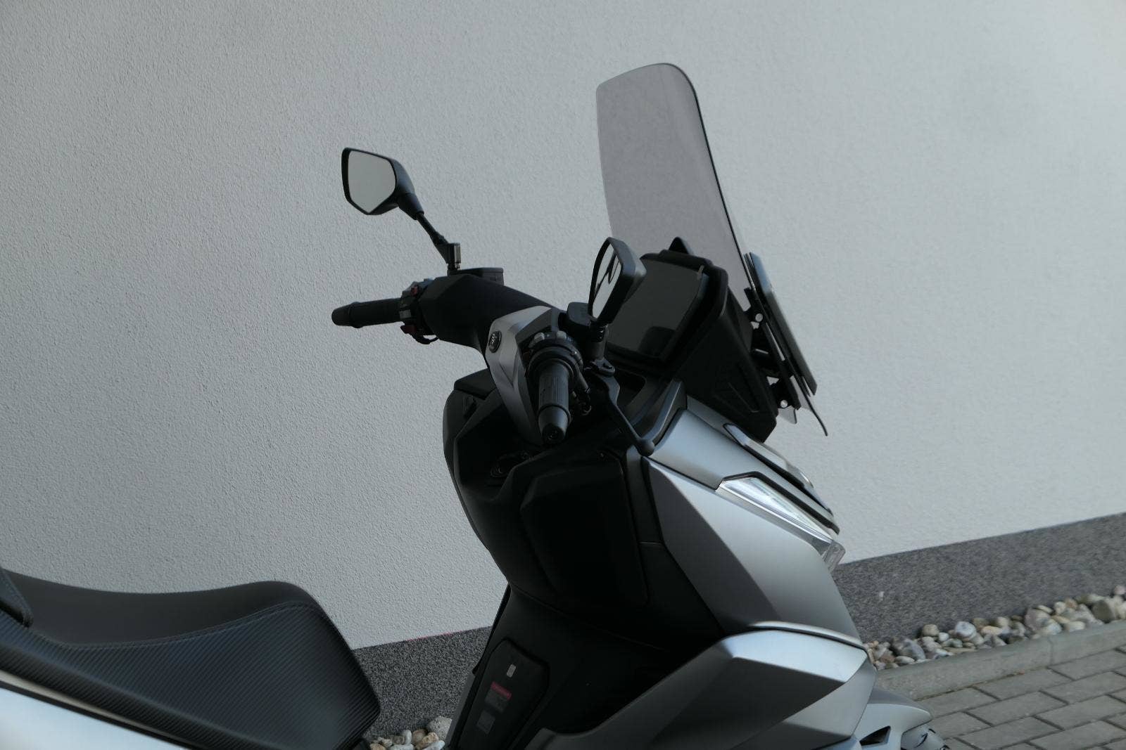 K tomu integrovaná palubní kamera s detektorem nárazu, kterej automaticky uloží záznam při nehodě. Elektrika je fajn, ale při brzdění spolíhám na starý dobrý železo, tedy dvoupístkový třmeny a kotouče. Ten vpředu má průměr 260 mm, zadní 240 mm. Na skútr slušný, co říkáš?