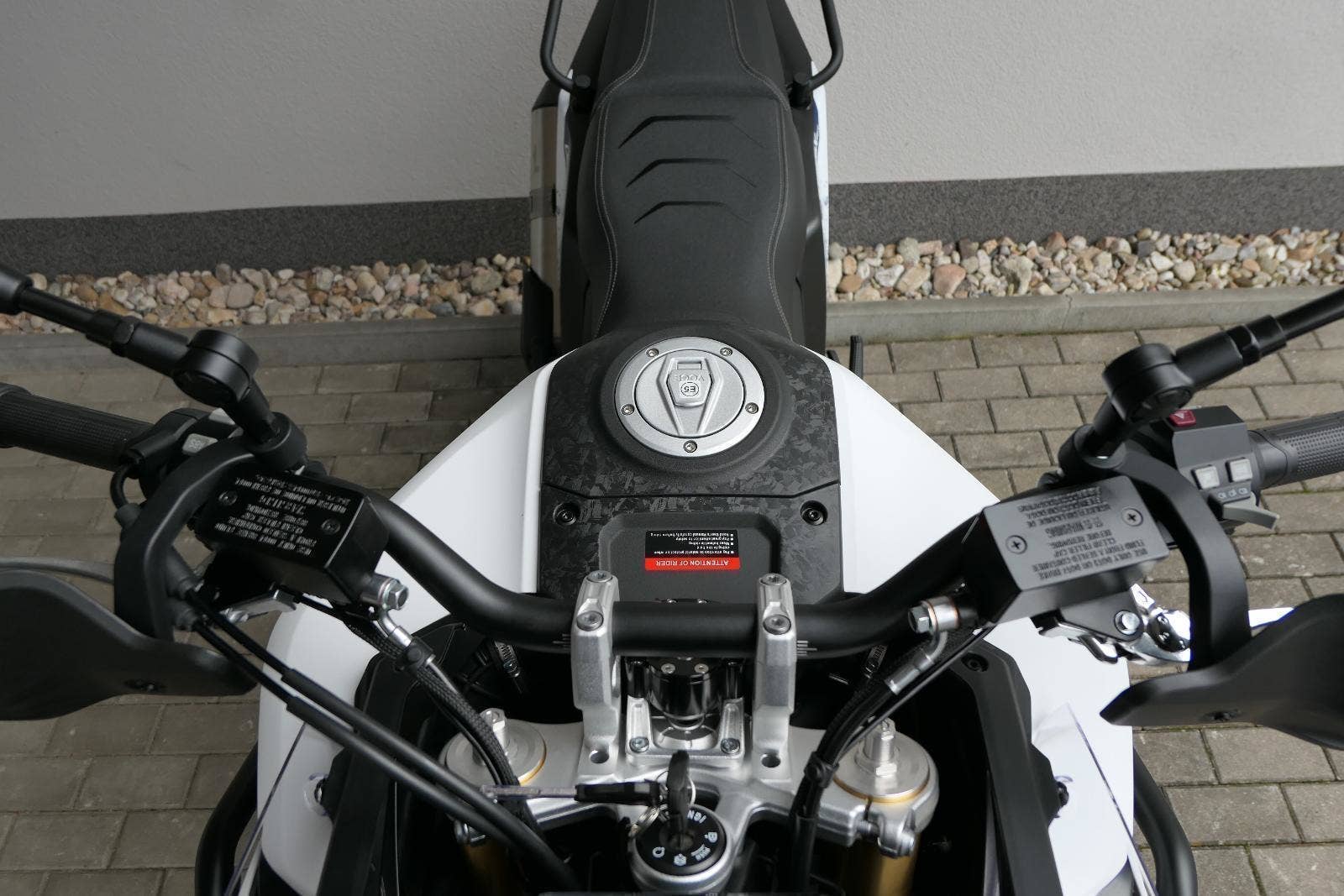 Tahle nádrž není jen designová pecka s ostře řezanejma rysama. Do vymakanýho těla dostaneš 24 litrů. S 5litrovou spotřebou si můžeš užívat svobodu celejch 480 kiláků! Z Prahy tak dofrčíš třeba až do Alp a ještě ti zbude na průzkum horskejch serpentin.