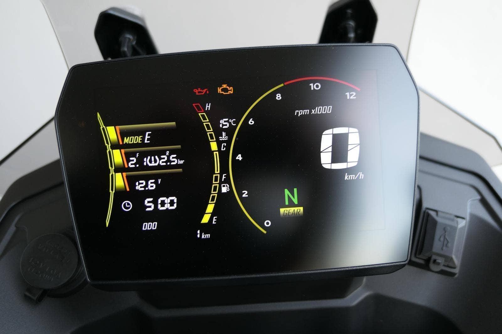 Kromě větší síly a lepšího podvozku mám taky vylepšenej 7palcovej displej. Má vyšší jas, takže na něm všecko krásně uvidíš i za vostrýho slunka. Mobil si snadno spáruješ pomocí blůtůčka. Jen co to uděláš, dostaneš na přístrojovku šipkovou navigaci, díky který nemineš ani tu nejzašitější odbočku. No a 12V zásuvka nebo USB konektor? Jasněže voboje!